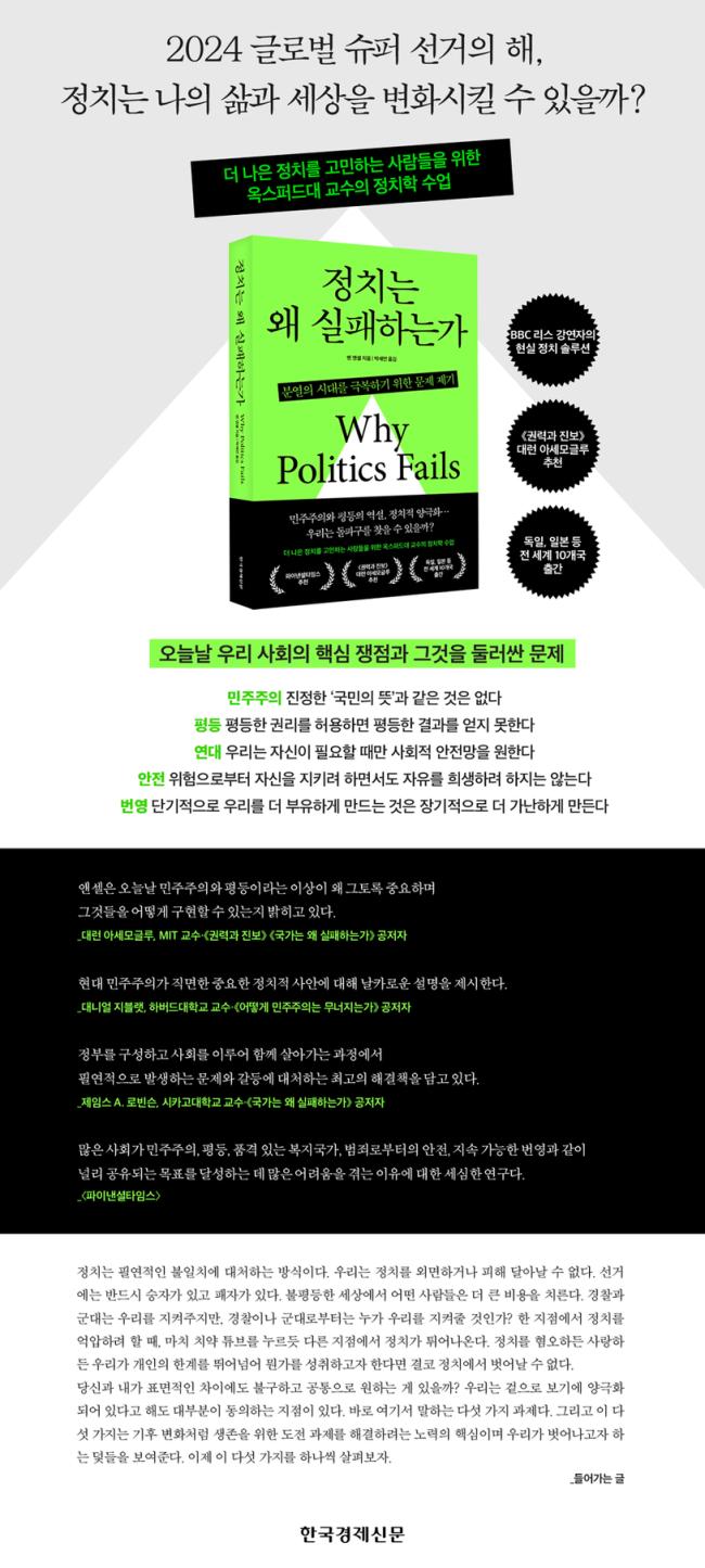 ÀÌ·± »óȲ¿¡¼ ¡¶Á¤Ä¡´Â ¿Ö ½ÇÆÐÇϴ°¡¡·´Â ±Ùº»ÀûÀÎ Áú¹®À» ´øÁø´Ù. ¡®Á¤Ä¡´Â ¿Ö ¿ì¸®ÀÇ »î°ú ¼¼»óÀ» ´õ ³´°Ô ¹Ù²ÙÁö ¸øÇßÀ»±î?¡¯ ¹°·Ð ³Ã¼Ò, Á¤Ä¡ Çø¿À¿Í´Â öÀúÇÏ°Ô °Å¸®¸¦ µÐ´Ù. ±× ¹Ý´ë´Ù. Á¤Ä¡¿¡ Èñ¸Á¿¡ Àֱ⿡, Á¤Ä¡°¡ ½ÇÆÐÇØ¿Â ÀÌÀ¯¸¦ ã¾Æº¸ÀÚ´Â °ÍÀÌ´Ù. ÀúÀÚ º¥ ¾Ø¼¿(Ben Ansell)Àº ¼¸¥´Ù¼¸ÀÇ ³ªÀÌ·Î ¿Á½ºÆÛµå´ë ±³¼ö·Î ÀÓ¿ëµÉ ¸¸Å ¿µ¹Ì±Ç¿¡¼ Ã˸Á¹Þ´Â Á¤Ä¡ÇÐÀÚ´Ù. ÃÖ±Ù¿¡´Â, ·Î¹öÆ® ¿ÀÆæÇÏÀ̸Ó, ½ºÆ¼ºì ȣŷ µîµµ Âü¿©ÇÑ Àû ÀÖ´Â ±³¾ç ÇÁ·Î±×·¥ ¡®BBC ¸®½º °ÀÇ¡¯¿¡ Ã⿬Çß´Ù.