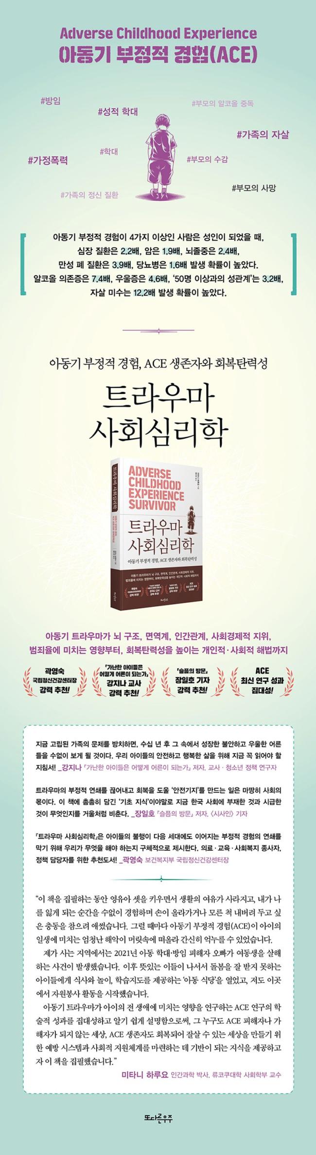 º¹Áö»çȸÇÐ, °¡Á·»çȸÇÐ ±ÇÀ§ÀÚÀÎ ¹ÌŸ´Ï ÇÏ·ç¿ä´Â ¹ÎÁ·, Àå¾Ö À¯¹«Ã³·³ °ÑÀ¸·Î µå·¯³ªÁö ¾Ê´Â ACE »ýÁ¸ÀÚÀÇ °íÅëÀ» ¡®»ç°¢Áö´ë¿¡ ÀÖ´Â ¼Ò¼öÀÚÀÇ ¹®Á¦¡¯¶ó°í Ç¥ÇöÇÑ´Ù. ÀúÀÚ´Â ¾Æµ¿±â Æ®¶ó¿ì¸¶°¡ ¾ÆÀÌÀÇ Àü »ý¾Ö¿¡ ¹ÌÄ¡´Â ¿µÇâÀ» ¿¬±¸ÇÏ´Â ACE ¿¬±¸ÀÇ ÇмúÀû ¼º°ú¸¦ Áý´ë¼ºÇÏ°í ¾Ë±â ½±°Ô ¼³¸íÇÔÀ¸·Î½á, ±× ´©±¸µµ ACE ÇÇÇØÀÚ³ª °¡ÇØÀÚ°¡ µÇÁö ¾Ê´Â ¼¼»ó, ACE »ýÁ¸ÀÚµµ ȸº¹µÇ¾î Àß»ì ¼ö ÀÖ´Â ¼¼»óÀ» ¸¸µé±â À§ÇÑ ¿¹¹æ ½Ã½ºÅÛ°ú »çȸÀû Áö¿øÃ¼°è¸¦ ¸¶·ÃÇÏ´Â µ¥ ±â¹ÝÀÌ µÇ´Â Áö½ÄÀ» Á¦°øÇϰíÀÚ ÀÌ Ã¥À» ÁýÇÊÇß´Ù.