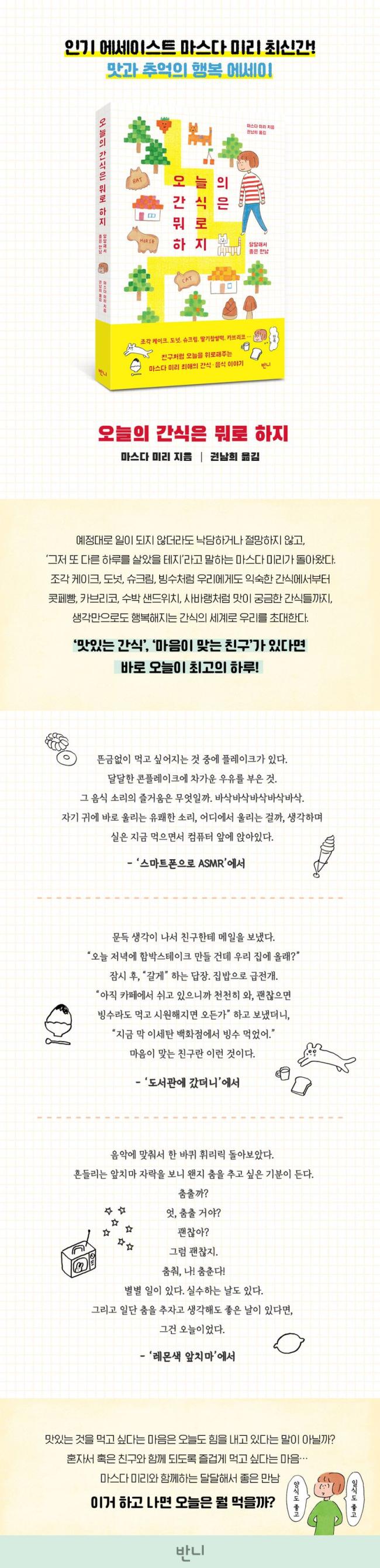 ÁÖ¿ä ÀÛǰÀ¸·Î ¡¶Áö±Ý ÀÌ´ë·Î ±¦ÂúÀº °É±î?¡·, ¡¶³ª´ä°Ô »ì°í ÀÖ½À´Ï´Ù¡·, ¡¶ÁÖ¸»¿£ ½£À¸·Î¡·, ¡¶¿À´Ãµµ »óó¹Þ¾Ò³ª¿ä?¡·, ¡¶¹Ì¿ì¶ó ¾¾ÀÇ Ä£±¸¡·, ¡¶¿À´ÃÀÇ Àλý¡·, ¡¶´©±¸³ªÀÇ ÀÏ»ý¡·, ¡¶ÇູÀº ´©±¸³ª °¡Áú ¼ö ÀÖ´Ù¡· µîÀÇ ¸¸È°¡ ÀÖÀ¸¸ç, ¡¶±Í¿©¿ò °ß¹®·Ï¡·, ¡¶¸ÅÀÏ À̰÷ÀÌ ÁÁ¾ÆÁý´Ï´Ù¡·, ¡¶ÀÛÀº ³ª¡·, ¡¶»ç¼ÒÇÑ °ÍµéÀÌ ½Å°æ ¾²ÀÔ´Ï´Ù¡·, ¡¶¼¼°è ¹æ¹æ°î°î ¿©Çà Àϱ⡷, ¡¶ÇູÀº À̾î´Þ¸®±â¡· µîÀÇ ¿¡¼¼ÀÌ¿Í ¡¶»¡¸®»¡¸®¶ó°í ¸»ÇÏÁö ¸¶¼¼¿ä¡·, ¡¶³Ê´Â ¾î¶² ÈûÀ» °¡Áö°í ÀÖ´Ï¡· µîÀÇ ±×¸²Ã¥ÀÌ ÀÖ´Ù. ¸¶½º´Ù ¹Ì¸®ÀÇ ¿¡¼¼ÀÌ´Â ¿ì¸® °çÀÇ Æò¹üÇÑ »ç¶÷°ú »ç¹°À» ´ÙÁ¤ÇÑ ½Ã¼±À¸·Î ¹Ù¶óº¸°í, ÀÏ»óÀÇ ¹Ý¦ÀÌ´Â ¼ø°£À» ã¾Æ³½´Ù.¡¶¿À´ÃÀÇ °£½ÄÀº ¹¹·Î ÇÏÁö¡· ¶ÇÇÑ ¿À´ÃÀÇ °£½ÄÀÌ °¡Á®´ÙÁÖ´Â ÀÛÀº Çູ°¨À» À§Æ® ÀÖ°Ô ±×¸®¸é¼ ½Å¼±ÇÑ ¿ôÀ½°ú °¨µ¿À» µ¶ÀÚ¿¡°Ô ¼±¹°ÇØÁØ´Ù.