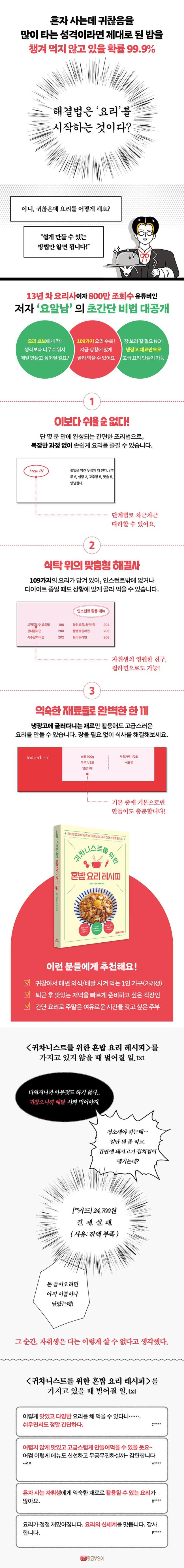 ÀÌ Ã¥¿¡´Â È¥ÀÚ¼µµ ¸ÀÀÖ°Ô Áñ±æ ¼ö ÀÖ´Â ÇÑ ±×¸© ¸Þ´º´Â ¹°·Ð, ¸ÅÀÏ ¸Ô¾îµµ Áú¸®Áö ¾Ê´Â ´Ù¾çÇÑ È¥¹ä ¸Þ´º°¡ °¡µæ ´ã°Ü ÀÖ½À´Ï´Ù. ¹ÝÂùÀÌ ÇÊ¿ä ¾ø´Â °£ÆíÇÑ ÇÑ ±×¸© Âî°³¿Í Âò ¿ä¸®ºÎÅÍ, ȨÆ÷Â÷ ºÐÀ§±â¸¦ ´À³¥ ¼ö ÀÖ´Â ¸ÀÀÖ´Â ºÐ½Ä ¸Þ´º±îÁö ´Ù¾çÇÏ°Ô ÁغñµÇ¾î ÀÖ°í¿ä. ¶Ç, ÀνºÅÏÆ® Àç·á¸¦ Ȱ¿ëÇϸ鼵µ ¿µ¾çÀ» ì±æ ¼ö ÀÖ´Â ·¹½ÃÇÇ¿Í ´ÙÀÌ¾îÆ®¸¦ °í·ÁÇÑ ÀúÄ®·Î¸® ½Ä´Ü±îÁö Æø³ÐÀº Å׸¶°¡ Æ÷ÇԵǾî ÀÖ´ä´Ï´Ù. ÃÑ 109°¡Áö ¿ä¸®¹ýÀ» ÅëÇØ, ¾î¶² »óȲ¿¡¼µµ ¸ÂÃãÇü ½Ä»ç¸¦ ½±°Ô ÁغñÇÒ ¼ö ÀÖÀ» °Å¿¹¿ä.