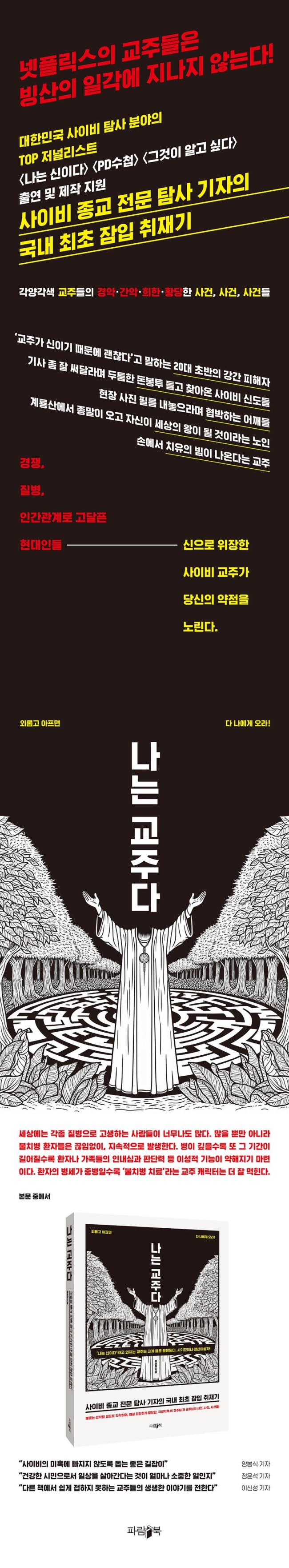 ¡´³ª´Â ½ÅÀÌ´Ù¡µ, ¡´±×°ÍÀÌ ¾Ë°í ½Í´Ù¡µ, ¡´PD¼öø¡µ µî ±¹³» Ž»ç º¸µµ ÇÁ·Î±×·¥ÀÌ »çÀ̺ñ Á¾±³ ÃëÀç Àü ÀÚ¹®À» ±¸ÇÏ´ø, 30³â °æ·ÂÀÇ ±¹³» ÃÖ°íÀÇ »çÀ̺ñ Àü¹® ÃëÀç±âÀÚ Àå¿îö. ¡´³ª´Â ½ÅÀÌ´Ù¡µ ÀÌÀç·Ï Æí¿¡´Â Á÷Á¢ Ã⿬Çϱ⵵ Çß´Ù. ±×°¡ À̹ø¿¡ Æì³½ ¡º³ª´Â ±³ÁÖ´Ù¡»´Â ¸» ±×´ë·Î ±³ÁÖµéÀÇ ÇàÅ¿¡ ´ëÇÑ °í¹ßÀÌ´Ù. Åë°èÀûÀ¸·Î ´ëÇѹα¹ÀÇ »çÀ̺ñ ±³ÁÖµéÀº µå·¯³ °Í¸¸ 80¿© ¸í¿¡ ´ÞÇÑ´Ù°í ÇÑ´Ù. ÇÏÁö¸¸ ÀúÀÚ´Â ±×°ÍÀº ¡®ºù»êÀÇ Àϰ¢¡¯ÀÏ »ÓÀ̸ç, »çÀ̺ñ Á¾±³ÀÇ Æ¯¼ºÀÌ ÀÚ±â ÀºÆóÀ̱⠶§¹®¿¡ ±×µéÀº ¿ì¸® ÁÖº¯ ¾ÆÁÖ °¡±î¿î °÷¿¡ ÀÖ´Ù°í À̾߱âÇÑ´Ù. ±³ÁÖÀÇ ¸¶°¢Àº ¿ì¸®¿Í ¿ì¸® °¡Á·, ÁÖº¯ »ç¶÷µé¿¡°Ô ¾ðÁ¦³ª »¸Ä¥ Áغñ°¡ µÇ¾î ÀÖ´Â °ÍÀÌ´Ù. Æò¹üÇØ º¸ÀÌ´Â ±³È¸·Î À§ÀåÇϰí, ¿µÀÔ ½ÅµµµéÀ» ´Ü°èÀûÀ¸·Î ¼¼³úÇØ¼ ±³ÁÖ¸¦ ½ÅÀ¸·Î ¹Ï°Ô ¸¸µå´Â ¼ö¹ýÀº 1ºÎ µÎ ¹øÂ° ²ÀÁö, ¡¸¾ÇÀÇ ¼Ò±¼¿¡¼ ºüÁ®³ª¿À´Â ±â¼ú¡¹¿¡¼ »ý»ýÇÏ°Ô ¹¦»çµÈ´Ù.