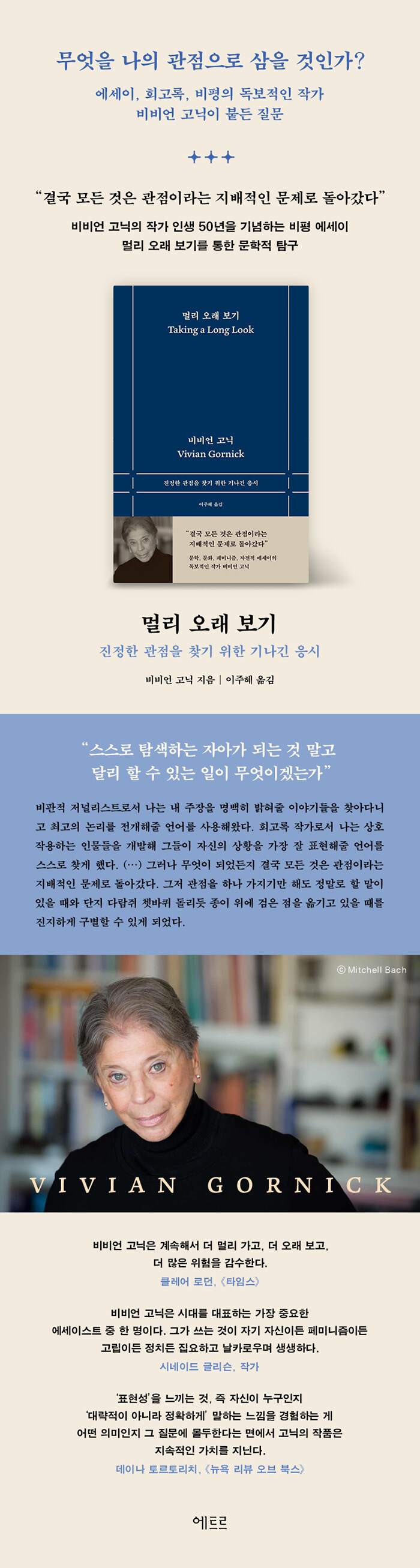 ÀÌ Ã¥ ¡¶¸Ö¸® ¿À·¡ º¸±â¡·´Â ºñÆò°¡ ºñºñ¾ð °í´ÐÀÇ ¼¼ºÎ¸¦ »ìÆìº¼ ¼ö ÀÖ´Â ºñÆò ÃѼ¶ó ÇÒ ¼ö ÀÖ´Ù. ÀÛ°¡ Àλý 50³â µ¿¾È ¹®ÇÐ, ¹®È, Æä¹Ì´ÏÁò µî »çȸ Àü¹ÝÀ» ³ÃöÇÑ ½Ã¼±À¸·Î »ìÇǸç Èû°ã°Ô ¾òÀº ±×ÀÇ °æÇèÀû ÅëÂûÀÌ ÀÌ ÇÑ ±Ç¿¡ ´ã°å´Ù. 1970³â´ë ¿©¼ºÇعæ¿îµ¿¿¡ ¿µ°¨À» ºÒ¾î³ÖÀº Æä¹Ì´ÏÁò ¿¡¼¼ÀÌ¿¡¼ ¾ÙÇÁ¸®µå ÄÉÀÌÁø, ¸Þ¸® ¸ÅÄ«½Ã, ´ÙÀֳ̾ª Æ®¸±¸µ µî ¸ÅȤÀûÀÎ ÀÛ°¡µéÀÇ »î°ú ÀÛǰÀ» ޱ¸ÇÑ ¹®ÇÐ ¿¡¼¼ÀÌ¿¡ À̸£±â±îÁö, °í´ÐÀÇ ºñÆòÀû ¿ª·®À» ¿À·ÔÀÌ È®ÀÎÇÒ ¼ö ÀÖ´Ù. ¹«¾ùº¸´Ù ÀÐ°í ¾²´Â »ç¶÷À¸·Î¼ °íÅ뽺·¯¿î ÀÚ±â ÀÌÇØÀÇ °úÁ¤À» ÅëÇØ °üÁ¡À» ´ÙÁ®¿Â ÀÛ°¡ÀÇ Ä¡¿ÇÑ ¹®ÇÐÀû ¿¸ÁÀ» ¸¸³¯ ¼ö ÀÖ´Ù.