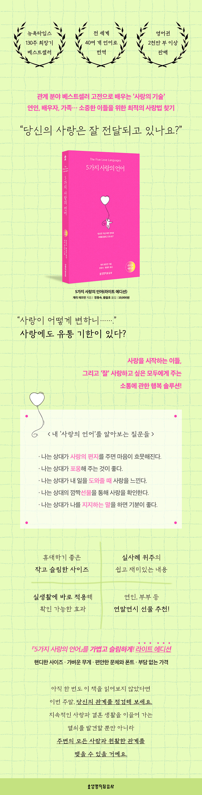 ÀÚ¹®ÇØ º¸ÀÚ. ´ç½ÅÀº ¿¬ÀÎ, Ä£±¸, °¡Á· µî »ç¶ûÇÏ´Â »ç¶÷µéÀÌ ¿øÇÏ´Â °ÍÀ» Á¤È®È÷ ¾Ë°í Àִ°¡? »ó´ë¹æÀº ³ªÀÇ »ç¶ûÀ» ÃæºÐÈ÷ ´À³¢°í Àִ°¡? ¼ö½Ê ³â°£ Àü ¼¼°èÀûÀ¸·Î °ËÁõµÈ ¡®5°¡Áö »ç¶ûÀÇ ¾ð¾î¡¯¸¦ °¡Àå Á¦´ë·Î ¹è¿ï ¼ö ÀÖ´Â ¹æ¹ýÀÌ ¿©±â ÀÖ´Ù. µû¶æÇÏ°í ³ë·ÃÇÑ »ó´ã°¡ÀÎ °Ô¸® äÇÁ¸ÕÀÇ ÀúÀÚ Á÷°À» ÀÐ¾î º¸ÀÚ.