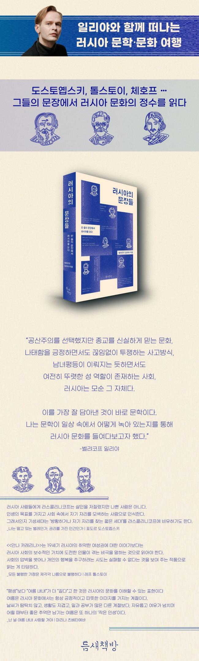 ÀÌÁ¦´Â Çѱ¹ ÀÛ°¡°¡ µÈ º§·ªÄÚÇÁ Àϸ®¾ß´Â »ý¼ÒÇÑ ·¯½Ã¾Æ ¹®È¸¦ Çѱ¹ µ¶ÀÚµéÀÌ ½±°Ô ÀÌÇØÇÒ ¼ö ÀÖµµ·Ï Çѱ¹Àû »ó½Ä°ú ¼Ó´ãÀ» Ȱ¿ëÇÏ¿© Çѱ¹ µ¶ÀÚµéÀ» À§ÇÑ ±ÛÀ» ½è´Ù. Àϸ®¾ß ƯÀ¯ÀÇ ³ÃöÇÑ ³í¸®¿¡ À§Æ®¸¦ ´õÇÑ ¹®Ã¼´Â Èï¹Ì¸¦ ¹è°¡½Ã¸é¼ µ¶ÀÚµéÀ» ·¯½Ã¾Æ ¹®ÇÐÀÇ ¼¼°è·Î ¾È³»ÇÑ´Ù.