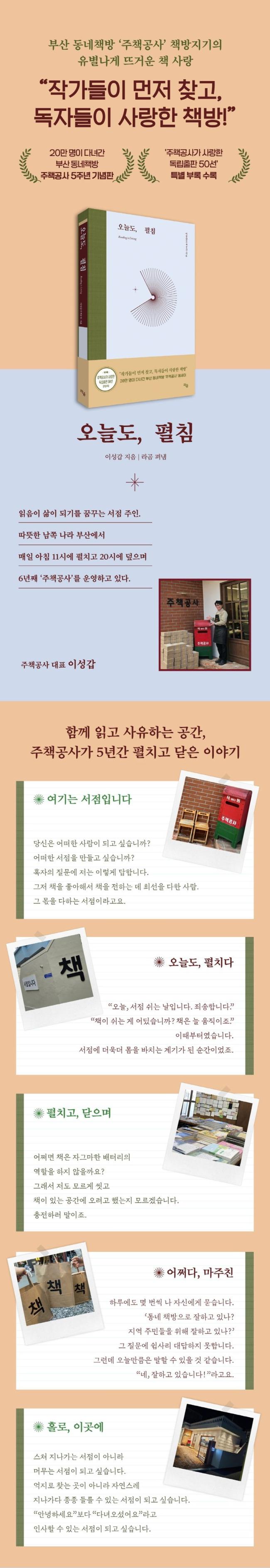 ÁÖÃ¥°ø»ç´Â ¿¬ÁßÈÞ¹«·Î ¿·Á ÀÖ´Ù. Ã¥Àº ½¬Áö ¾Ê±â ¶§¹®¿¡, ÇÑ ±ÇÀÇ Ã¥ÀÌ ÇÑ »ç¶÷ÀÇ ÀλýÀ» ¹Ù²Ü ¼ö ÀÖ´Ù°í ÀúÀÚ´Â ¹Ï±â ¶§¹®ÀÌ´Ù. ÀÌ Ã¥ÀÇ Á¦¸ñÀÌ¡º¿À´Ãµµ, Æîħ¡»ÀÎ °Íµµ ¿À´Ãµµ ¾î±è¾øÀÌ Ã¥¹æÀ» ÆîÄ¡°í, Ã¥À» ÆîÄ¡°í, ¶Ç ´Ù¸¥ µ¶ÀÚ¿ÍÀÇ ¸¸³²À» ÆîÄ£´Ù´Â µ¥ ÀÖ´Ù. ±×¸®ÇÏ¿© ¿À´Ãµµ Ã¥¹æÀ» ÆîÄ£´Ù.