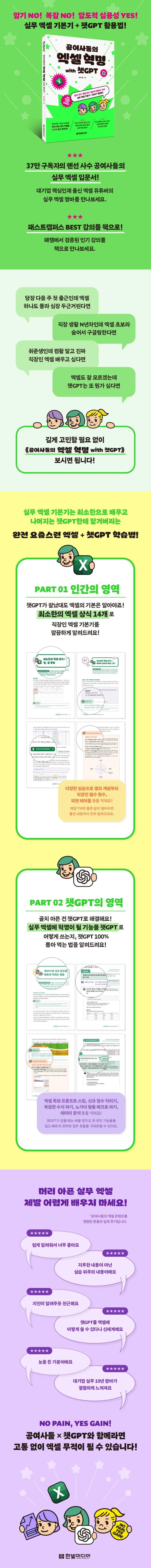À̸¦ À§ÇØ ÀÌ Ã¥Àº 2°³ PART·Î ±¸¼ºÇß´Ù. 'PART 01 Àΰ£ÀÇ ¿µ¿ª : ÃÖ¼ÒÇÑÀ¸·Î ¹è¿ì´Â ½Ç¹« ¿¢¼¿ »ó½Ä ¸¶Áö³ë¼±'¿¡¼´Â ½Ç¹« ¿¢¼¿¿¡ ÇÊ¿äÇÑ ±âÃÊ °³³äÀ» ÀÍÈ÷°í, 'PART 02 êGPTÀÇ ¿µ¿ª : AI ½Ã´ëÀÇ ÀÏÀß·¯´Â êGPT ÀÌ·¸°Ô ¾¹´Ï´Ù'¿¡¼´Â êGPT¸¦ Ȱ¿ëÇØ °ñÄ¡ ¾ÆÇ ¾÷¹« »óȲÀ» ÇØ°áÇÏ´Â ¹æ¹ýÀ» ÀÍÈù´Ù. ÀÌ Ã¥À» ÀÐ°í ³ª¸é ¸·¸·Çß´ø ¿¢¼¿°ú êGPT°¡ ¸¸¸¸ÇØÁ® ±×³É ÀÏÀß·¯µµ ¾Æ´Ñ, AI ½Ã´ë êGPT¸¦ Àû±Ø Ȱ¿ëÇÏ´Â ÀÏÀß·¯°¡ µÉ ¼ö ÀÖ´Ù.