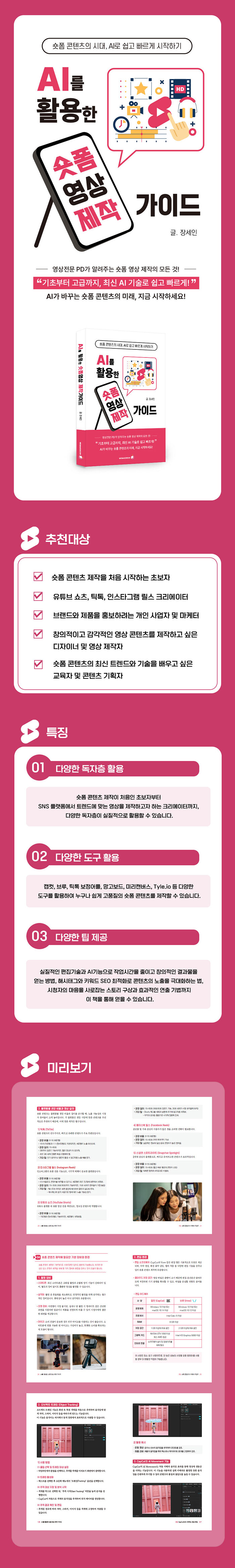 ÀÌ Ã¥Àº ¼ôÆû ÄÜÅÙÃ÷ Á¦ÀÛÀÌ Ã³À½ÀÎ Ãʺ¸ÀÚºÎÅÍ SNS Ç÷§Æû¿¡¼ Æ®·»µå¿¡ ¸Â´Â ¿µ»óÀ» Á¦ÀÛÇϰíÀÚ ÇÏ´Â Å©¸®¿¡ÀÌÅͱîÁö, ´Ù¾çÇÑ µ¶ÀÚÃþÀÌ ½ÇÁúÀûÀ¸·Î Ȱ¿ëÇÒ ¼ö ÀÖµµ·Ï ±¸¼ºµÇ¾ú´Ù. ½ÇÀü ¿¹Á¦¿Í ÃֽŠƮ·»µå ºÐ¼®À» ÅëÇØ µ¶ÀÚµéÀÌ Ç÷§Æû¿¡ ÃÖÀûÈµÈ ÄÜÅÙÃ÷¸¦ Á¦ÀÛÇϰí, À̸¦ ÅëÇØ ´õ ¸¹Àº ³ëÃâ°ú ¼º°ú¸¦ ¾òÀ» ¼ö ÀÖµµ·Ï Áö¿øÇÑ´Ù.