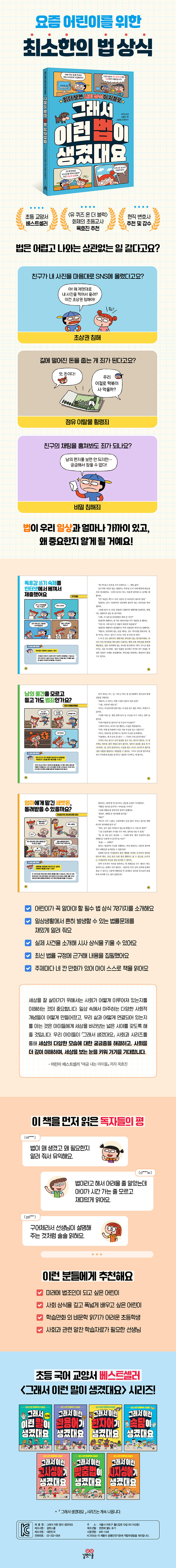 ¹ýÀ̶õ ¹«¾ùÀÌ°í ¿Ö ÇÊ¿äÇÑÁö ÀÚ¿¬½º·´°Ô ¾Ë°Ô ÇÏ´Â ¾î¸°ÀÌ¿ë ¹ý ±³¾ç¼´Ù. ÃÑ 70¿© °¡ÁöÀÇ ´Ù¾çÇÑ ¹ý À̾߱⸦ ¿ôÀ½º¸ ÅÍÁö´Â ³× Ä ¸¸È¿Í Èï¹Ì·Î¿î À̾߱â·Î Ç®¾î³», ¾î·Æ°í µüµüÇÑ ¹ýÀ» Àç¹Õ°Ô ¹è¿ï ¼ö ÀÖ´Ù. Ã¥À» Àд٠º¸¸é ¹ý¿¡ ´ëÇÑ ¹æ´ëÇÑ Áö½ÄÀÌ ½×ÀÌ´Â °ÍÀº ¹°·Ð, ±Ç¸®¿Í Ã¥ÀÓ, °øÁ¤ÇÔ, ¹è·ÁÀÇ °¡Ä¡¸¦ ÇÔ²² ±ú´Ý°Ô µÈ´Ù. ÃʵîÇб³ ÁßÇгâºÎÅÍ ÁßÇлý±îÁö ´©±¸³ª Èï¹Ì·Ó°Ô ÀÐÀ» ¼ö ÀÖÀ¸¸ç, °¡Á¤°ú Çб³¿¡¼ µÎ·ç Ȱ¿ëÇϱâ ÁÁÀº Ã¥ÀÌ´Ù.