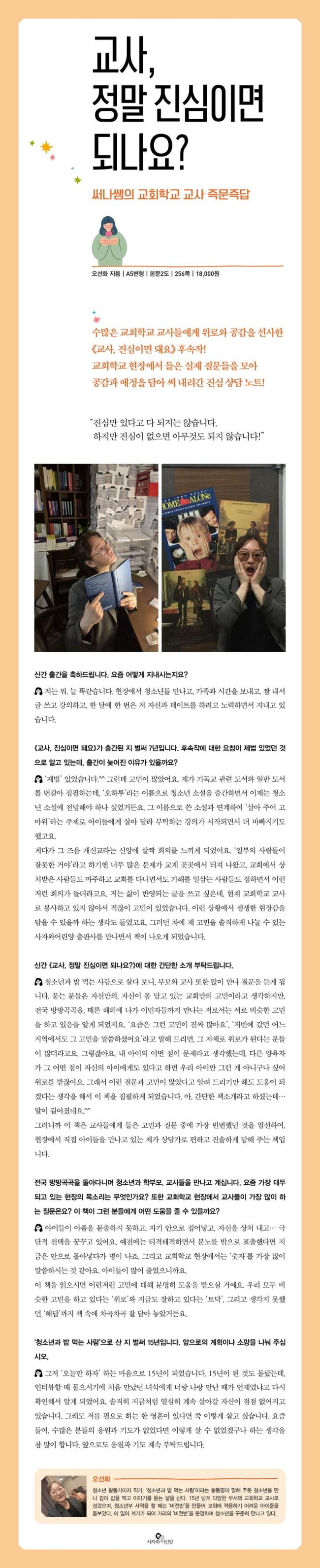 15³â ³Ñ°Ô ¡®Ã»¼Ò³â°ú ¹ä ¸Ô´Â »ç¶÷¡¯À¸·Î ¼ö¸¹Àº û¼Ò³âµéÀÇ Èú¸µ ¸àÅä·Î Ȱµ¿ÇØ ¿Â ¿À¼±È ÀÛ°¡´Â ½ÅÀÛ ¡¶±³»ç, Á¤¸» Áø½ÉÀÌ¸é µÇ³ª¿ä?¡·¿¡¼, ±³È¸Çб³ ÇöÀå °÷°÷¿¡¼ ¹ÞÀº ¼±»ý´ÔµéÀÇ ÀÌ·¯ÇÑ °í¹Î¿¡ ´ëÇØ Àý´ë °ø°¨ÇÏ¸ç ±íÀº À§·Î¸¦ ´ã¾Æ Áø½ÉÀ¸·Î ´äÇØ ÁØ´Ù. ÀÌÁ¦´Â ±³È¸Çб³ ±³»ç Çʵ¶¼·Î ÀÚ¸® ÀâÀº ¡¶±³»ç, Áø½ÉÀÌ¸é µÅ¿ä¡·(2018)¸¦ Ãâ°£ÇÑ µÚ·Î ÀúÀÚ´Â ¡°±³»ç, ¡®Á¤¸»¡¯ Áø½ÉÀÌ¸é µÇ³ª¿ä?¡±¶ó´Â Áú¹®À» Âü ¸¹ÀÌ ¹Þ¾Ò´Ù°í ÇÑ´Ù. ÀÌ¿¡ ±×³à´Â ¡°Áø½É¸¸ ÀÖ´Ù°í ´Ù µÇÁö´Â ¾Ê½À´Ï´Ù. ÇÏÁö¸¸ Áø½ÉÀÌ ¾øÀ¸¸é ¾Æ¹«°Íµµ µÇÁö ¾Ê½À´Ï´Ù¡±¶ó°í °Á¶Çϸç, ±³È¸Çб³ ±³»ç¿¡°Ô °¡Àå ±ÍÁßÇÑ ´ö¸ñÀº ¡®Áø½É¡¯, ¾ÆÀ̵鿡 ´ëÇÑ ¡®Áø½É¡¯, »ç¶÷¿¡ ´ëÇÑ ¡®Áø½É¡¯, ¿¹¼ö´Ô¿¡ ´ëÇÑ ¡®Áø½É¡¯, º¹À½¿¡ ´ëÇÑ ¡®Áø½É¡¯ÀÓÀ» ´Ù½Ã±Ý µé·ÁÁØ´Ù.