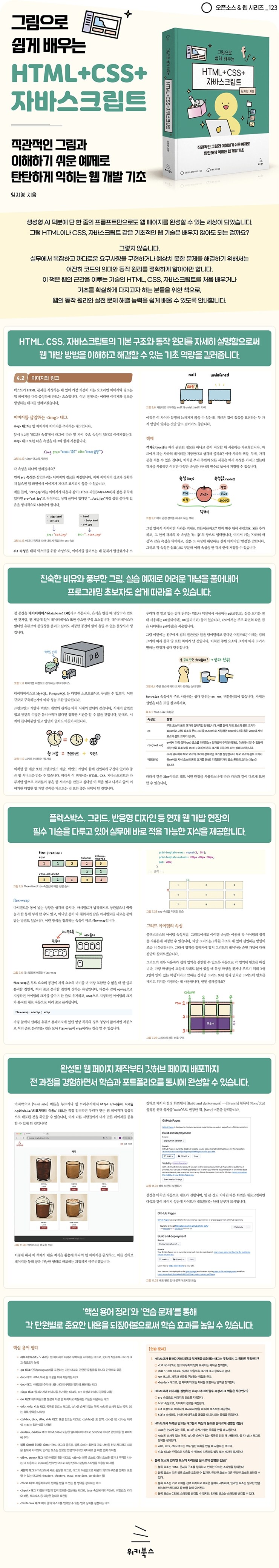 À¥ ÆäÀÌÁöÀÇ »À´ë¸¦ ±¸¼ºÇÏ´Â HTML, ½ºÅ¸ÀÏÀ» ´ã´çÇÏ´Â CSS, µ¿ÀûÀÎ ±â´ÉÀ» ±¸ÇöÇÏ´Â ÀÚ¹Ù½ºÅ©¸³Æ®±îÁö, À¥ °³¹ßÀÇ ÇÙ½É ±â¼úÀ» ±×¸²°ú ½Ç»ýȰ ºñÀ¯¸¦ Ȱ¿ëÇØ ´©±¸³ª ÀÌÇØÇϱ⠽±°Ô Ç®¾î³Â´Ù. óÀ½ °³¹ß µµ±¸¸¦ ¼³Ä¡ÇÏ´Â °ÍºÎÅÍ ½ÃÀÛÇØ, Á÷Á¢ µû¶ó ÇØº¸´Â ½Ç½ÀÀ» ÅëÇØ ±âÃÊ °³³äÀ» ÀÚ¿¬½º·´°Ô ÀÍÈ÷°í, ³ª¸¸ÀÇ À¥ ÆäÀÌÁö¸¦ ¿Ï¼ºÇغ¸´Â ½ÇÀü ÇÁ·ÎÁ§Æ®·Î ½Ç·ÂÀ» źźÈ÷ ´ÙÁú ¼ö ÀÖ´Ù.