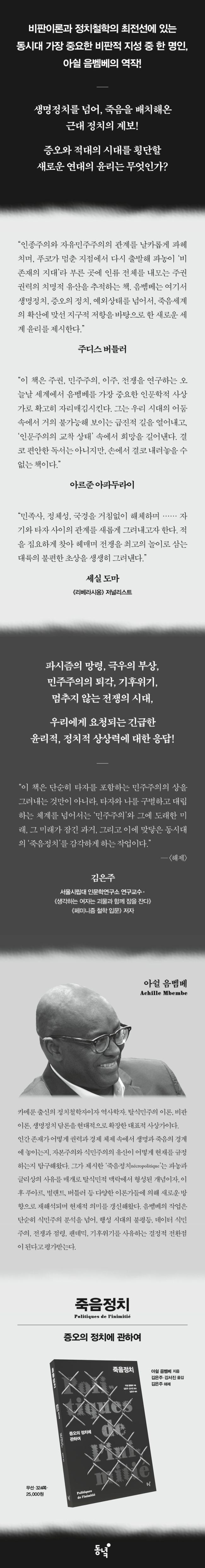 ¡¶Á×À½Á¤Ä¡¡·´Â ÀÌ·¯ÇÑ ¾Æ½¯ À½º¨º£ÀÇ »ç»óÀû ±ËÀûÀ» ´ëÇ¥Çϴ åÀ¸·Î, µ¿½Ã´ë ¹ÎÁÖÁÖÀÇÀÇ Åðº¸¿Í ÀÌÅ», Æø·Â, ¹èÁ¦¿Í ºÐ¸®, Çø¿À¿Í Áõ¿ÀÀÇ Á¤Ä¡°¡ ¾î¶»°Ô ÀÛµ¿ÇؿԴÂÁö¸¦ µå·¯³½´Ù. ƯÈ÷ Å»½Ä¹ÎÀû ¸Æ¶ô¿¡¼ ǪÄÚÀÇ »ý¸íÁ¤Ä¡, ½´¹ÌÆ®¿Í ¾Æ°¨º¥ÀÇ ¿¹¿Ü»óÅ µîÀ» ºñÆÇÀûÀ¸·Î µ¶ÇØÇϰí È®ÀåÇØ ¡®Á×À½Á¤Ä¡¡¯¶ó´Â °³³äÀ» ÀÌ Ã¥¿¡¼ Á¤¸³Çϰí È®ÀåÇÏ¸ç ¼¼°èÀÇ Áö¼º°è¸¦ Èçµé¾ú´Ù. (ÀÌ Ã¥Àº ÇÁ¶û½º¾îÆÇ ¡¶Politiques de l¡¯inimitie(Áõ¿ÀÀÇ Á¤Ä¡)¡·(2016)¸¦ ¿ì¸®¸»·Î ¿Å±ä °ÍÀ̳ª, ÀúÀÚÀÇ ¿äûÀ¸·Î ÀúÀÚÀÇ ¿µ¹® ³í¹®ÀÎ