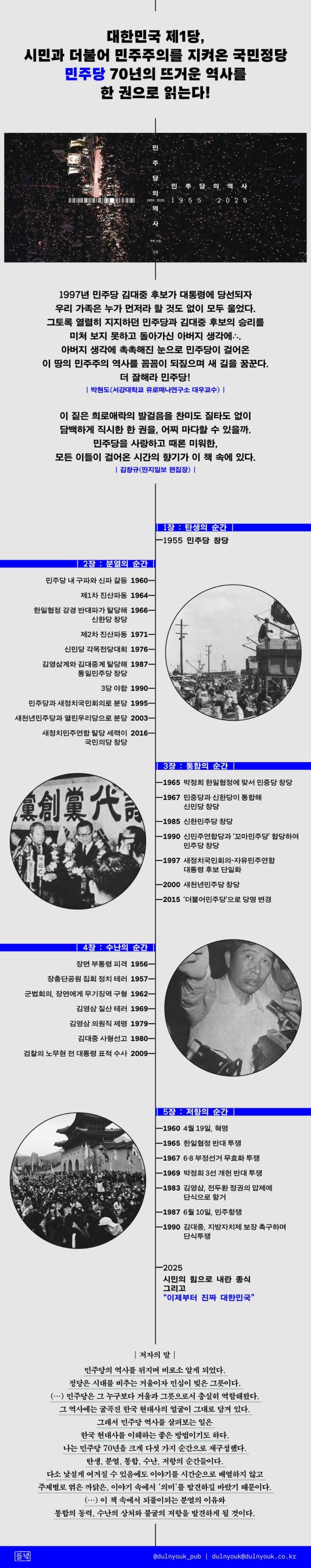 ¡¸1Àå. ź»ýÀÇ ¼ø°£¡¹Àº À̽¸¸ Äíµ¥Å¸ºÎÅÍ ¡®¹Ýµ¶Àç ¹ÎÁÖÈ¡¯¸¦ ±âÄ¡·Î ´ëµ¿´Ü°áÇØ ¹ÎÁÖ´çÀ» â´çÇϱâ±îÁö À̾߱⸦ ´ã¾Ò´Ù. ¡¸2Àå. ºÐ¿ÀÇ ¼ø°£¡¹Àº 4¡¤19Çõ¸íÀ¸·Î ¹ÎÁÖ´çÀÌ Áý±ÇÇÑ Á÷ÈÄ ½Å±¸ÆÄ·Î ºÐ¿ÇÏ¿´´ø À̾߱âºÎÅÍ 2015³â »õÁ¤Ä¡¹ÎÁÖ¿¬ÇÕ ºÐ¿¿¡ À̸£±â±îÁöÀÇ À̾߱⸦ ´ã¾Ò´Ù. µû¶ó¼ 2ÀåÀº ¹ÎÁÖ´çÀÇ ºÎ²ô·¯¿î ¿ª»ç¸¦ ´ãÀº ÀåÀ̱⵵ ÇÏ´Ù. ¡¸3Àå. ÅëÇÕÀÇ ¼ø°£¡¹¿¡´Â 1965³â ÇÑÀÏÇùÁ¤¿¡ ¸Â¼ ÀÏ¾î³ ¹ÎÁß´ç â´çºÎÅÍ ´õºÒ¾î¹ÎÁÖ´ç Ãâ¹ü±îÁö, ±â»Ú°í °¨°Ý½º·¯¿î ¿ª»ç¸¦ ÆîÃij´Ù. ¡¸4Àå. ¼ö³ÀÇ ¼ø°£¡¹¿¡¼´Â Àå¸é ºÎÅë·É Àú°Ý »ç°ÇºÎÅÍ ÀÌÀç¸í Å×·¯ »ç°Ç±îÁö¸¦ µÇ¤À¸¸ç ¸ðÁø °í³°ú ½Ã·Ã¿¡µµ ÁÂÀýÇÏÁö ¾Ê°í ¾ÕÀ¸·Î ³ª¾Æ°¡´Â ¹ÎÁÖ´çÀÇ ¿ë±â¿Í ²ö±â¸¦ º¸¿©ÁÖ°íÀÚ Çß´Ù. ±×¸®°í ¸¶Áö¸· ¡¸5Àå. ÀúÇ×ÀÇ ¼ø°£¡¹Àº 1958³â º¸¾È¹ý ÆÄµ¿ºÎÅÍ À±¼®¿ ³»¶õ±îÁö, ½Ã¹Î°ú ÇÔ²² ºÒ±¼ÀÇ Á¤½ÅÀ¸·Î ÀúÇ×Çϸç Çѱ¹ ¹ÎÁÖÈÀÇ ¿ª»ç¸¦ »õ±ä ÀÚ¶û½º·¯¿î ¼ø°£µéÀ» ´Ù·é´Ù. »ç°ÇÀÇ ¼øÂ÷ÀûÀÎ È帧À» ¾Ë°í Á» ´õ ÀÚ¼¼È÷ »ìÆìº¸°í ½ÍÀº µ¶ÀÚµéÀ» À§ÇØ ±Ç¹Ì¿¡ ¿¬Ç¥¿Í ¹ÎÁÖ´ç°è Á¤´ç °èº¸µµ, ã¾Æº¸±âµµ ¼ö·ÏÇß´Ù.