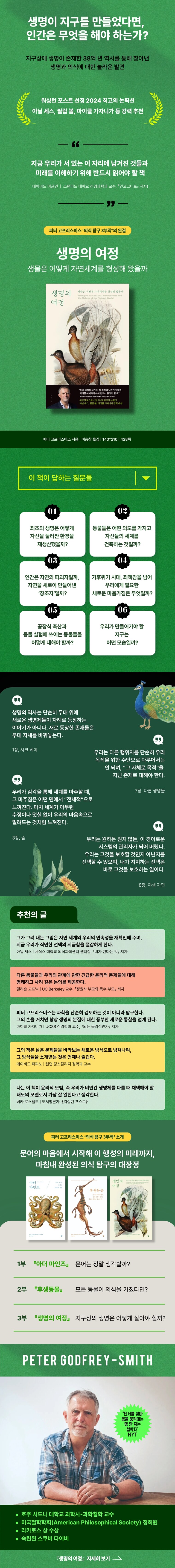 ´ÙÀ̺ùÀ» ÇÏ¸ç ¹®¾î¶ó´Â »ý¸íü¸¦ ¸¸³ª ±×ÀÇ ¸¶À½°ú ÀǽĿ¡ ´ëÇØ ±íÀÌ Å½±¸ÇØ ¿Â ÀúÀÚ´Â ¼¼°èÀû º£½ºÆ®¼¿·¯ ¡º¾Æ´õ ¸¶ÀÎÁî¡»¿¡¼ ¡®°á±¹ ¹®¾î¿Í Àΰ£Àº »ý¸íÀÇ ³ª¹«¿¡ ÇÔ²² ÀÖ´Â Á¸À硯¶ó¸ç °¡Àå ´Ù¸£Áö¸¸ µ¿µîÇÑ ÁöÀ§¸¦ °¡Áø »ý¹°À̶ó°í ÁÖÀåÇÑ´Ù. ¡ºÈÄ»ýµ¿¹°¡»¿¡¼ ÀÌÈÄ ±× ´ë»óÀ» È®´ëÇØ Áö±¸»óÀÇ ¸ðµç ÈÄ»ýµ¿¹°µé ¿ª½Ã ÀڽŵéÀÇ »ý°¢À» ÆîÄ¡¸ç »ì°í ÀÖÀ½À» ޱ¸ÇÑ´Ù. ÀÌÁ¦ °íÇÁ¸®½º¹Ì½º´Â ¹Ù±ùÀ¸·Î ½Ã¼±À» µ¹·Á 'ÀÇ½Ä 3ºÎÀÛ'ÀÇ ¿Ï°áÆí ¡º»ý¸íÀÇ ¿©Á¤¡»À» ³»³õ¾Ò´Ù. ÀÌ Ã¥Àº 38¾ï ³â µ¿¾È À̾îÁø ÁöÁúÇаú »ý¹°ÇÐÀÇ ¿ª»ç¸¦ µû¶ó°¡¸ç, »ý¸íÀÌ ´Ü¼øÈ÷ ÁøÈÀÇ '°á°ú¹°'ÀÌ ¾Æ´Ï¶ó ȯ°æÀ» ¹Ù²Ù´Â '¿øÀÎ'À̾úÀ½À» Áõ¸íÇØ ³ª°£´Ù. ±×¸®°í Áö±Ý ¹ß µó°í ¼± ÀÌ ¶¥ÀÌ ´©±¸ÀÇ ÀÛǰÀÎÁö, ±×¸®°í ´ç½ÅÀÌ ±× ÀÛǰ¿¡ ¾î¶² ÈçÀûÀ» ³²±æ °ÍÀÎÁö¸¦ ±ú´Ý°Ô ¸¸µç´Ù.