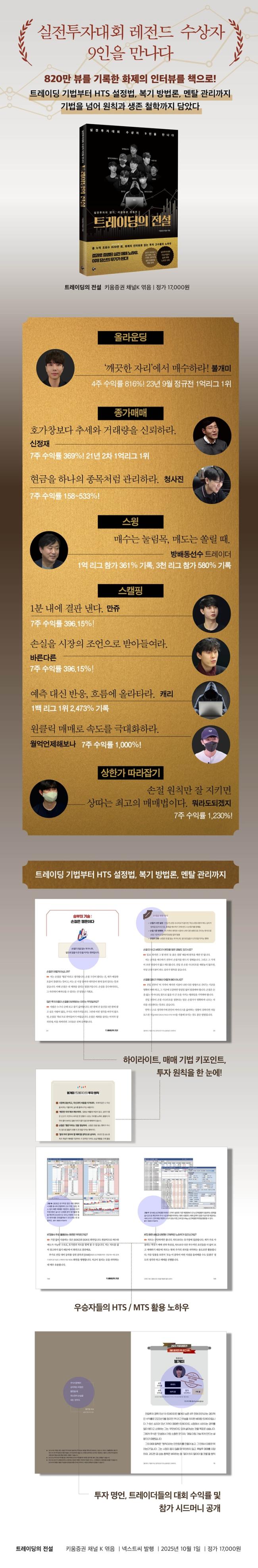 ¶Ç Çϳª ÁÖ¸ñÇÒ Á¡Àº ÀÌ Ã¥¿¡ ´ã±ä ½Å·Ú¼ºÀÌ´Ù. ¿©±â µîÀåÇÏ´Â 9ÀÎÀÇ Æ®·¹ÀÌ´õ´Â ¸ðµÎ Ű¿ò¿µ¿õÀü ½ÇÀüÅõÀÚ´ëȸ ÀÔ»óÀÚµéÀÌ´Ù. Çѱ¹°Å·¡¼Ò ½ÃÀå°¨½ÃÀ§¿øÈ¸ÀÇ ºÒ°øÁ¤°Å·¡ ½É»ç¸¦ Åë°úÇÑ ¼º°úÀÌÀÚ ±â·ÏÀ» ¹ÙÅÁÀ¸·Î, ¡®½Ç·Â°ú ½Å·Ú¡¯°¡ °ËÁõµÈ ¸ñ¼Ò¸®¶ó´Â Á¡¿¡¼ Àǹ̰¡ Å©´Ù. ½ÇÁ¦ °Å·¡ ³»¿ª°ú ¿øÄ¢À» ±Ù°Å·Î ÇÑ »ì¾Æ ÀÖ´Â Áõ¾ðÀÌÀÚ, ¼ö¸¹Àº °³ÀÎÅõÀÚÀÚ¿¡°Ô ½ÇÁúÀûÀÎ ±³°ú¼°¡ µÉ ¼ö ÀÖ´Â ±â·ÏÀÌ´Ù.