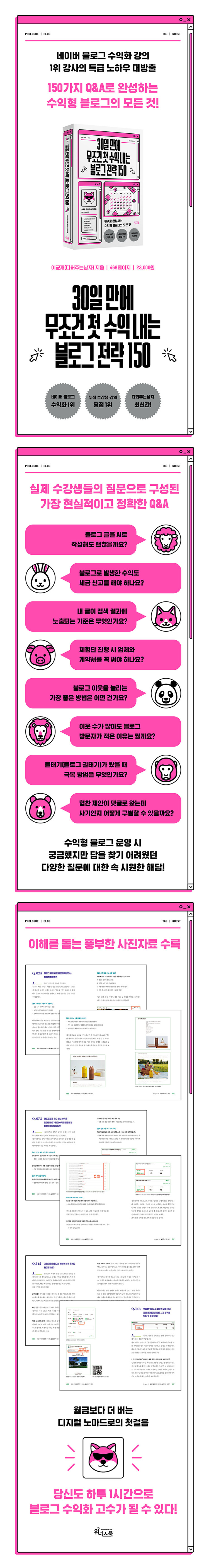 ÃÑ 150°³ÀÇ Áú¹®°ú ÀÀ´äÀ¸·Î ¿Ï¼ºµÈ ¹®´äÁýÀÌÀÚ ÇØ°á¼ÀÎ ÀÌ Ã¥Àº ºí·Î±× Ãʺ¸ºÎÅÍ °í¼ö±îÁö, ºí·Î±×¸¦ ¿î¿µÇÏ¸ç ¸¶ÁÖÇÒ ¼ö ÀÖ´Â ´Ù¾çÇÑ »óȲ°ú °í¹ÎÀ» ´ã¾Æ ¾î¶² »óȲ¿¡¼µç µµ¿òÀ» ¾òÀ» ¼ö ÀÖµµ·Ï Çß´Ù. ºí·Î±× ±âº» ¼³Á¤ºÎÅÍ ÄÜÅÙÃ÷ Á¦ÀÛ ÆÁ, °Ë»ö ³ëÃâ, ÀÌ¿ô °ü¸®, üÇè´Ü ¹× ±¤°í ÁøÇà µî ºí·Î±×¸¦ ¿î¿µÇÏ¸ç ±Ã±ÝÁõÀÌ »ý±æ ¶§¸é ¾ðÁ¦µç ÆîÃ帰í Á¶¾ðÀ» ¾òÀ» ¼ö Àִ åÀÌ´Ù.