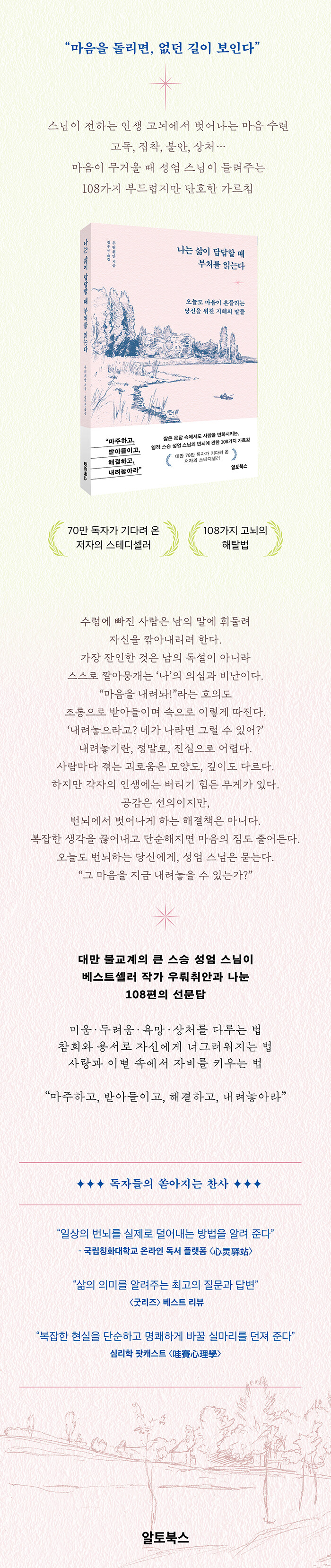 ÀÌ Ã¥Àº ¼º¾ö ½º´ÔÀÇ ±ú´ÞÀ½°ú ÁöÇý¸¦ ¹ÙÅÁÀ¸·Î ¸¶À½ÀÌ Èçµé¸± ¶§ ¾î¶»°Ô Áß½ÉÀ» ÀâÀ» ¼ö ÀÖ´ÂÁö, ¹ø³ú¸¦ ¾î¶»°Ô ´Ù·ç°í ³õÀ» ¼ö ÀÖ´ÂÁö¸¦ ¾Ë·Á ÁÖ´Â »îÀÇ ¾È³»¼´Ù. Àд٠º¸¸é ¡®³ªµµ ¸ð¸£°Ô¡¯ ½º´Ô²² Áú¹®À» ´øÁö°í, ±× ´ë´ä ¼Ó¿¡¼ ÀÚ½ÅÀÇ ±æÀ» ¹ß°ßÇÏ°Ô µÈ´Ù. ¿À´Ãµµ ¸¶À½ÀÌ ¹«°Ì°í »ý°¢ÀÌ ¸¹¾Æ Àá ¸ø ÀÌ·ç´Â À̶ó¸é, ÀÌ Ã¥ ¼Ó 108ÆíÀÇ ´ëȰ¡ ¹ø³ú¸¦ Ç®¾î³»´Â ù°ÉÀ½ÀÌ µÉ °ÍÀÌ´Ù. ±×¸®°í ¾ðÁ¨°¡, ´ç½Åµµ ¼º¾ö ½º´ÔÀÇ ¸»Ã³·³ Á¶¿ëÈ÷ °í°³¸¦ ²ô´öÀÌ¸ç ¼Ó»èÀÏÁö ¸ð¸¥´Ù. ¡°¸¶À½À» µ¹¸®´Ï, ¼¼»óÀÌ ´Þ¶óÁ³´Ù.¡±