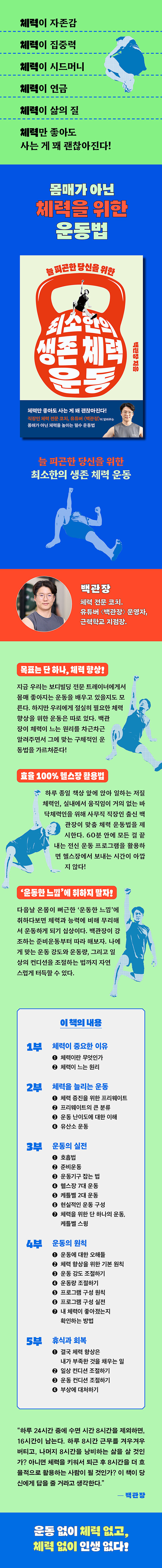 ¡¶ÃÖ¼ÒÇÑÀÇ »ýÁ¸ ü·Â ¿îµ¿¡·ÀÇ ¸ñÀûÀº È®½ÇÇÏ´Ù. ü·ÂÀ» ³ôÀÌ´Â ¿îµ¿À» ¼Ò°³ÇÏ´Â °ÍÀÌ´Ù. ÀÌ Ã¥ÀÇ ÀúÀÚÀÎ ¹é°üÀåÀº Á÷ÀåÀΠü·Â Àü¹® ÄÚÄ¡ÀÌÀÚ ¡®Á÷ÀåÀΠü·Â »ó´ã¼Ò¡¯¶ó´Â À̸§À» °Ç À¯Æ©ºê ¿î¿µÀÚÀ̱⵵ ÇÏ´Ù. ±×´Â ÀÌ Ã¥¿¡¼ ü·ÂÀ̶õ ¹«¾ùÀ̰í, ü·ÂÀ» Ű¿î´Ù´Â °ÍÀº ¹«½¼ ÀǹÌÀÎÁö¸¦ Á¤È®È÷ ¤¾îÁÖ°í, ü·ÂÀ» Ű¿ì±â À§ÇØ ÇØ¾ß ÇÏ´Â Çʼö ¿îµ¿À» ±¸Ã¼ÀûÀÎ ¹æ¹ý°ú źźÇÑ ÀÌ·ÐÀ¸·Î ¼³¸íÇÑ´Ù.