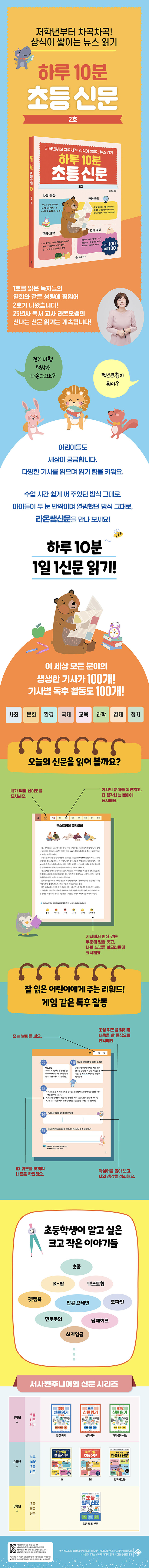 ÀϹÝÀûÀÎ ½Å¹® ±â»ç ºÐ·ù Áß¿¡¼ ¾î¸°À̰¡ ÀÌÇØÇÒ ¼ö ÀÖ°í ÀÚ½ÅÀÇ »î°ú ´õ ¸Â´ê¾Æ ÀÖ´Â ºÐ·ù·Î ±¸¼ºÇß½À´Ï´Ù. »çȸ, ¹®È, ȯ°æ, ±¹Á¦, ±³À°, °úÇÐ, °æÁ¦, Á¤Ä¡ ¸ðµÎ 8°³ ºÐ¾ßÀÇ ´Ù¾çÇÑ ±â»ç¸¦ ¸¸³ª º¸¼¼¿ä. ¡®ÁÖ¸»¿¡´Â 2½Ã°£¸¸ ´õ ÀÚÀÚ¡¯, ¡®°ñ¶ó ¸Ô´Â ÀÚÀ²¼±Åñ޽ġ¯, ¡®±³º¹ ÀԱ⠽Ⱦî¿ä!¡¯Ã³·³ ¾î¸°ÀÌ ÁÖº¯ÀÇ ½¬¿î ¼ÒÀçºÎÅÍ ¡®Çб³ Æø·Â, ½Å°íÇϱâ Àü¿¡ Àá±ñ!¡¯, ¡®´Ù¹®Èµµ ÁÁ¾Æ¿ä!¡¯Ã³·³ Ä£±¸¿Í ÀÌ¿ôÀ» µ¹¾Æº¸´Â À̾߱â, ¡®¹°¿¡ Àá±â´Â Åõ¹ß·ç¡¯, ¡®À¯·´, ¹Ý·Áµ¿¹° ÆÇ¸Å ±ÝÁö¡¯Ã³·³ ȯ°æ°ú ¼¼°è·Î °ü½ÉÀ» ³ÐÈ÷´Â À̾߱â±îÁö, Å©°í ÀÛÀº ±â»ç 100°³¸¦ ¸ð¾Ò½À´Ï´Ù. ±â»ç¸¦ Èï¹Ì·Ó°Ô Àд٠º¸¸é »çȸ, °æÁ¦, ±³À°, ȯ°æ µî ¼¼»ó ¸ðµç °ÍÀº °á±¹ ¿¬°áµÇ¾î ÀÖ´Ù´Â °ÍÀ» ¾Ë°Ô µË´Ï´Ù. ÀÚ¿¬½º·´°Ô ÀÚ½ÅÀÇ °ü½É ¿µ¿ªµµ ¹ß°ßÇÏ°Ô µÇÁö¿ä. ÇÏ·ç 10ºÐÀÌ¸é µË´Ï´Ù.