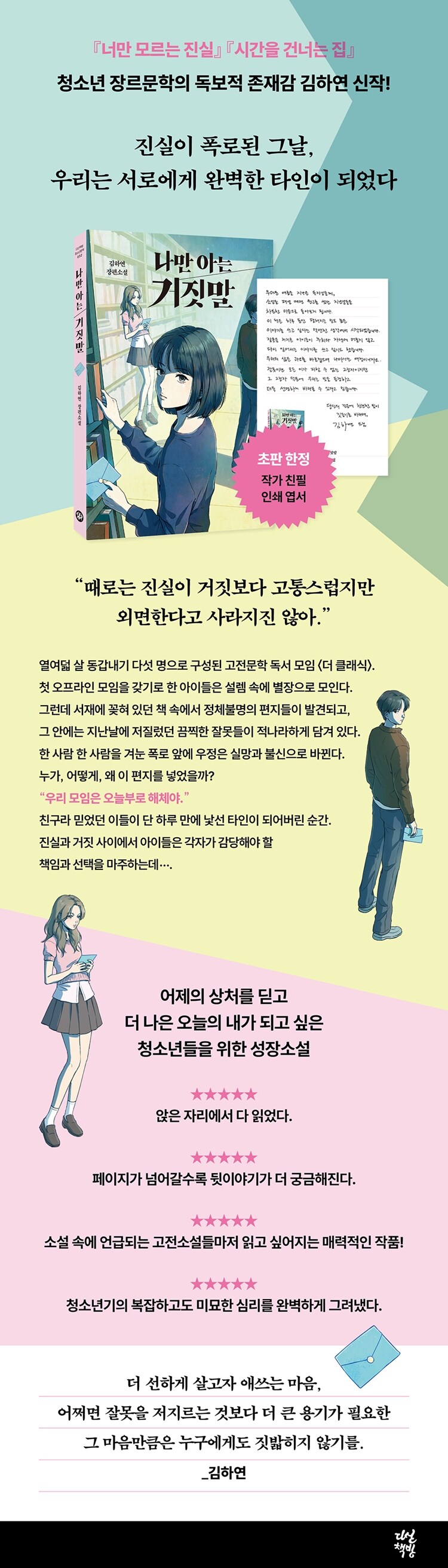 û¼Ò³â º£½ºÆ®¼¿·¯ ÀÛ°¡ ±èÇÏ¿¬ÀÇ 2025³â ÃÖ°í ±â´ëÀÛ ¡º³ª¸¸ ¾Æ´Â °ÅÁþ¸»¡»ÀÌ Ãâ°£µÇ¾ú´Ù. ¡º½Ã°£À» °Ç³Ê´Â Áý¡»À¸·Î û¼Ò³â ÆÇŸÁöÀÇ ÁöÆòÀ» ¿°í, ¡º³Ê¸¸ ¸ð¸£´Â Áø½Ç¡»·Î °ü°è¿Í Áø½ÇÀ» µÑ·¯½Ñ ³¯Ä«·Î¿î Ã߸®¸¦ ÆîÃĿ ±×´Â À̹ø ½ÅÀÛ ¡º³ª¸¸ ¾Æ´Â °ÅÁþ¸»¡»À» ÅëÇØ ´Ù½Ã Çѹø ÀÚ±ØÀûÀÎ ¿ä¼Ò ¾øÀ̵µ ÆØÆØÇÑ ±äÀå°¨°ú ¹ÝÀüÀÇ Áñ°Å¿òÀ» ´À³¢°Ô ÇØÁÖ´Â, û¼Ò³âÀ» À§ÇÑ ¡®¹«ÇØÇÑ¡¯ Ã߸®¼Ò¼³·Î µ¶ÀÚµéÀ» ¸¸³´Ù. °íÀü¼Ò¼³ µ¶¼ ¸ðÀÓ ¸â¹öµé »çÀÌ¿¡¼ ¹ú¾îÁø Àǹ®ÀÇ Æø·Î »ç°ÇÀ» ÅëÇØ û¼Ò³âÀÌ °Þ´Â ºÒ¾È°ú ÁËÃ¥°¨, Ã¥ÀÓÀÇ ¹®Á¦¸¦ ÇÑ ÆíÀÇ À¥µå¶ó¸¶°°ÀÌ ¸ôÀÔ°¨ ³ôÀº À̾߱â·Î Ç®¾î³Â´Ù. À帣Àû ±äÀå°¨ ¼Ó¿¡¼ ¿Ü¸éÇÒ ¼ö ¾ø´Â Áø½Ç°ú ÁøÁ¤ÇÑ ³ª ÀÚ½ÅÀ» ¸¶ÁÖÇÏ´Â ¼ºÀåÀÇ ¼ø°£À» Æ÷ÂøÇØ ³½ ¡º³ª¸¸ ¾Æ´Â °ÅÁþ¸»¡»Àº ¾îÁ¦º¸´Ù ´õ ³ªÀº ³»°¡ µÇ°íÇ ¸ðµç ÀÌ¿¡°Ô °Ç³×´Â ¶ß°Å¿î ÀÀ¿øÀÌ ´ã±ä ¼ºÀå¼Ò¼³ÀÌ´Ù.