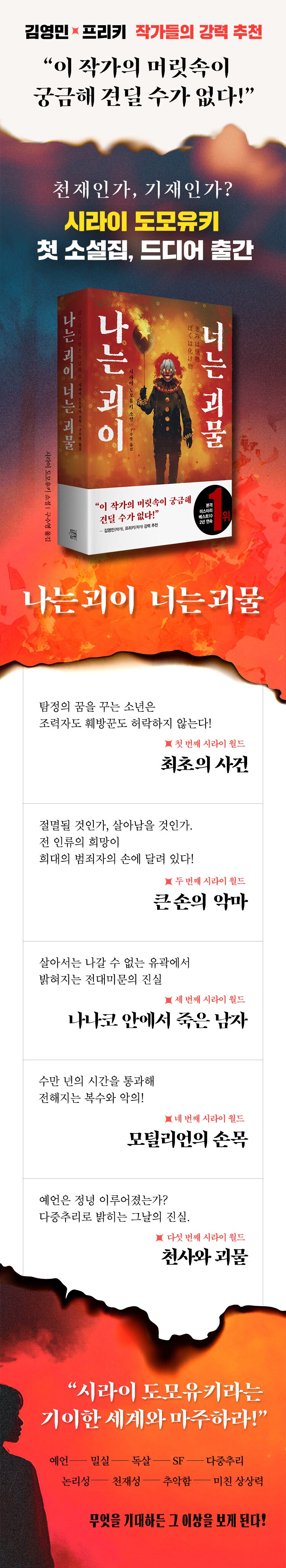 ¹«¼¿î ±â¼¼·Î ¡®º»°Ý ¹Ì½ºÅ͸®¡¯ÀÇ ÃÖÀü¼±À» ³ÐÇô¿Â ½Ã¶óÀÌ µµ¸ðÀ¯Å°ÀÇ Ã¹ ¼Ò¼³Áý ¡¶³ª´Â ±«ÀÌ ³Ê´Â ±«¹°¡·ÀÌ µåµð¾î Çѱ¹ µ¶ÀÚµéÀ» ¸¸³´Ù. µ¿±Þ»ý ½À°ÝÀ» ÁÀ´Â ÃʵîÇб³ ¸íŽÁ¤(¡´ÃÖÃÊÀÇ »ç°Ç¡µ)°ú Àý¸êÀ» ¾ÕµÐ ÀηùÀÇ ¸í¿îÀ» Áû¾îÁø ¹üÁËÀÚ(¡´Å« ¼ÕÀÇ ¾Ç¸¶¡µ), À¯°ûÀ» ÈÛ¾´ ¿¬¼â µ¶»ì»ç°Ç(¡´³ª³ªÄÚ ¾È¿¡¼ Á×Àº ³²ÀÚ¡µ), ¼ö¸¸ ³â Àü ȼ®ÀÇ ¼ö¼ö²²³¢(¡´¸ðÆ¿¸®¾ðÀÇ ¼Õ¸ñ¡µ), ¿À·¡ÀüÀÇ ¿¹¾ðÀ» Áõ¸íÇϵí ÀÏ¾î³ ¹Ð½Ç»ç°Ç(¡´Ãµ»ç¿Í ±«¹°¡µ)¿¡ À̸£±â±îÁö, ¹è°æºÎÅÍ À帣±îÁö ´ÙÁ¾´Ù¾çÇÑ ´Ù¼¸ °¡Áö À̾߱Ⱑ µ¶ÀÚ¸¦ ¸Â´Â´Ù. ¿¹¾ð, ¹Ð½Ç, µ¶»ì, SF, ´ÙÁßÃ߸®¡¦ ¸ðµç ÀåÄ¡°¡ ÆøÁ×ó·³ ÅÍÁöÁö¸¸, ¼»ç´Â °ß°íÇÏ°í ÆÛÁñÀº ÇÑÃþ Á¤±³ÇØÁ³´Ù. ºÒÆíÇÔ°ú Äè°¨ÀÌ ±³Â÷ÇÏ´Â ±× ÁöÁ¡¿¡¼ ½Ã¼±À» °ÅµÎÁö ¸øÇÏ°Ô ÇÏ´Â, À帣¸¦ ÇѰè±îÁö ¹Ð¾îºÙÀÌ´Â ÀÛ°¡ÀÇ ÇÊ·ÂÀÌ ¡®¿ª½Ã ½Ã¶óÀÌ µµ¸ðÀ¯Å°!¡¯¶ó´Â ź¼ºÀ» ÅͶ߸®°Ô ÇÑ´Ù.