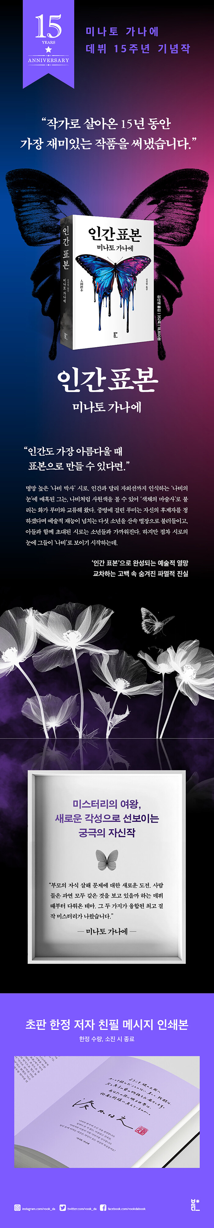 2008³â ¡º°í¹é¡»À¸·Î Çý¼ºÃ³·³ µ¥ºßÇØ ÁÖ°£¹®Ãá ¹Ì½ºÅ͸® º£½ºÆ® 1À§¿¡ ·©Å·, Á¦6ȸ ¼Á¡´ë»óÀ» ¼ö»óÇϸç ÀϺ» ¹®Çа踦 µÚÈçµç ÀÛ°¡ ¹Ì³ªÅä °¡³ª¿¡. ±×°¡ µ¥ºß 15ÁÖ³âÀ» ¸Â¾Æ ¾´ ±â³äºñÀûÀÎ ½ÅÀÛ ¡ºÀΰ£ Ç¥º»¡»ÀÌ ºÏ´Ù¿¡¼ Ãâ°£µÇ¾ú´Ù. ³ªºñ ÇÐÀÚ »çīŰ ½Ã·Î°¡ ´Ù¼¸ ¸íÀÇ ¹Ì¼Ò³âÀ» »ìÇØÇÏ°í ½Ã½ÅÀ» °¡°øÇØ ´Ù¾çÇÑ ³ªºñ¿¡ ºø´í ¡®Àΰ£ Ç¥º»¡¯À» ¸¸µé¾ú´Ù°í °í¹éÇÏ´Â ¼ö±â·Î ½ÃÀ۵Ǵ ¡ºÀΰ£ Ç¥º»¡». ¡®³ªºñÀÇ ½Ã¼±¡¯À̶ó´Â µ¶Æ¯ÇÑ ¸ðƼºê¿Í ¹Ì(Ú¸)¸¦ ÇâÇÑ ±¤±â°¡ ¸Â¹°¸®´Â ÀÌ ¼¶¶àÇϰí Ž¹ÌÀûÀÎ ¹Ì½ºÅ͸® ¼Ò¼³ÀÇ ÁýÇÊ °è±â¿¡ ´ëÇØ ÀÛ°¡´Â ÀϺ» ÀÎÅͺ信¼ ´ÙÀ½°ú °°ÀÌ ¹àÇû´Ù.