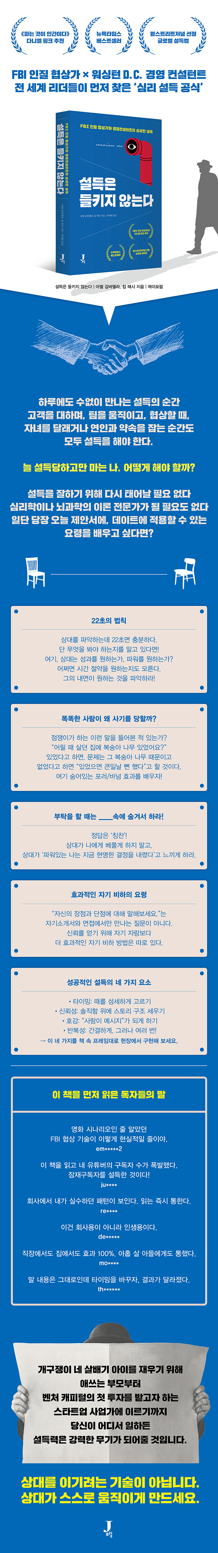 FBI ÀÎÁú Çù»ó°¡¿Í ±Û·Î¹ú °æ¿µÄÁ¼³ÅÏÆ®°¡ ÇöÀå¿¡¼ Ȱ¿ëÇÑ ½É¸® Àü·«À» ÅëÇØ, »ó´ë°¡ ÀúÇ×ÇÏÁö ¾Êµµ·Ï ºÐÀ§±â¸¦ ¸¸µé°í ½Å·Ú¸¦ ½×´Â °úÁ¤À» ±¸Ã¼ÀûÀ¸·Î Á¦½ÃÇÑ´Ù. ¼³µæÀº »ó´ë¸¦ ¹Ð¾îºÙÀÌ´Â ±â¼úÀÌ ¾Æ´Ï¶ó ½º½º·Î ¿òÁ÷ÀÌ°Ô ¸¸µå´Â ±¸Á¶¸¦ Àд ÀÏÀÌ´Ù. ¸»Àº ³¡³µ´Âµ¥ ¸¶À½ÀÌ ¿òÁ÷ÀÌÁö ¾Ê¾Ò´Ù¸é, ÀÌ Ã¥ÀÌ ±× ÀÌÀ¯¸¦ ¸íÈ®È÷ ¹àÇôÁÙ °ÍÀÌ´Ù.