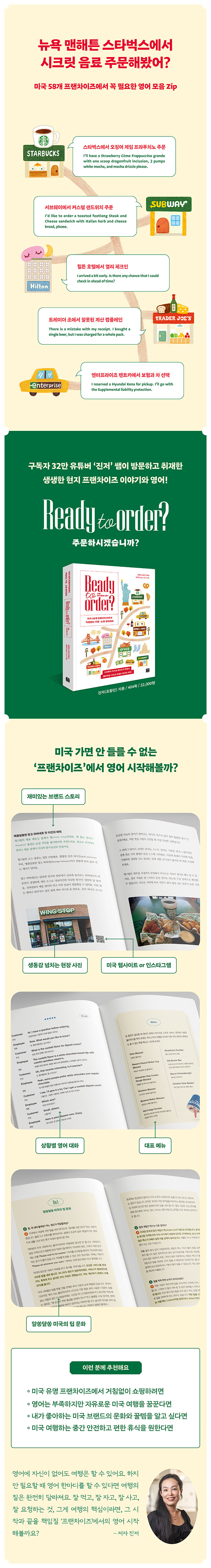 ¡¶READY TO ORDER? ÁÖ¹®ÇϽðڽÀ´Ï±î?¡·´Â ¹Ì±¹ ¿©ÇàÀÚµéÀÌ °¡Àå ÀÚÁÖ Ã£´Â ÇÁ·£Â÷ÀÌÁî ¡¤ üÀÎ ºê·£µå 58°÷À» Áß½ÉÀ¸·Î, ÇöÀå¿¡¼ ¹Ù·Î ¾µ ¼ö ÀÖ´Â ¡®»ì¾Æ ÀÖ´Â ¿µ¾î¡¯¸¦ ´ãÀº ½ÇÀü ¿µ¾î °¡À̵åºÏÀÌ´Ù.