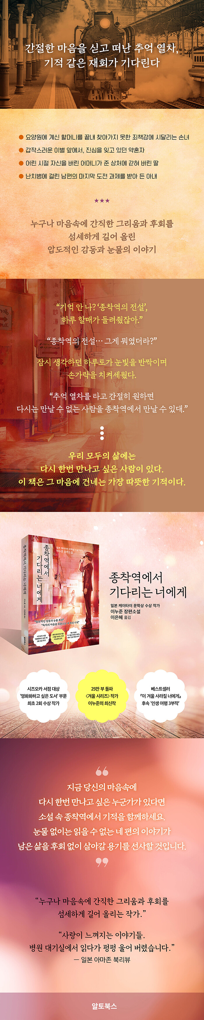 ±×ÀÇ ÀÛǰÀº ´Ã ¡®»ç¶÷°ú »ç¶÷À» À̾î ÁÖ´Â ¸¶Áö¸· ÇѸ¶µð¡¯¸¦ ´Ù·ç¸ç, ´©±¸³ª ¸¶À½¼Ó¿¡ °£Á÷ÇÑ ±×¸®¿ò°ú ÈÄȸ¸¦ ¼¶¼¼ÇÏ°Ô ±æ¾î ¿Ã¸°´Ù. À̹ø ¼Ò¼³ ¡ºÁ¾Âø¿ª¿¡¼ ±â´Ù¸®´Â ³Ê¿¡°Ô¡»µµ ½ÃÁî¿ÀÄ«ÀÇ µ§·ùÇϸ¶³ªÄÚ Ã¶µµ Á¾Á¡, °¡Äɰ¡¿Í¿ªÀ» ¹è°æÀ¸·Î ¡®´Ù½Ã´Â ¸¸³¯ ¼ö ¾ø´Â ¼ÒÁßÇÑ »ç¶÷¡¯À» ÇâÇÑ °£ÀýÇÑ ±â´Ù¸²°ú ±âÀû °°Àº ÀçȸÀÇ ¼ø°£À» ±×·Á ³½´Ù. µû¶æÇϸ鼵µ ´«¹°°Ü¿î ¹®ÀåÀ¸·Î, µ¶ÀÚÀÇ ¸¶À½ ±íÀº °÷¿¡ ¿À·¡µµ·Ï ³²´Â ¿©¿îÀ» ÀüÇÑ´Ù. ±×ÀÇ À̾߱⸦ ÆîÄ¡´Â ¼ø°£ ´ç½Åµµ ¾ðÁ¨°¡ÀÇ ¼ÒÁßÇÑ ±â¾ï°ú ¸¶ÁÖÇÏ°Ô µÉ °ÍÀÌ´Ù.