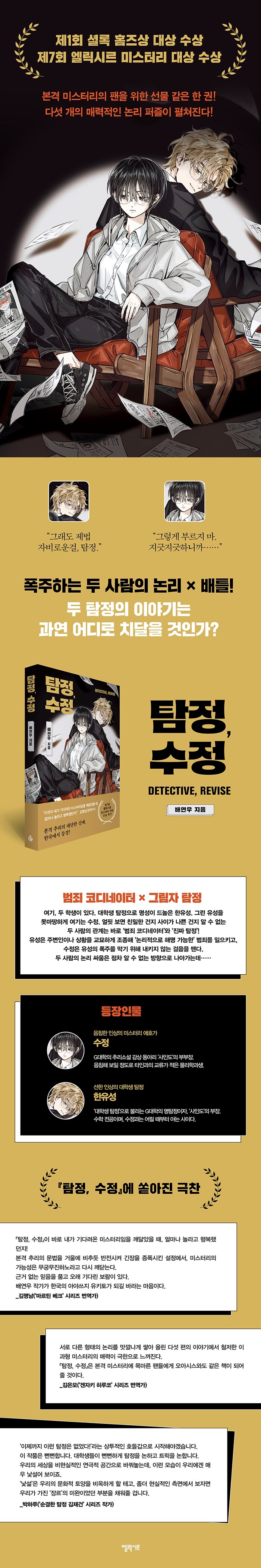 ¡ºÅ½Á¤, ¼öÁ¤¡»Àº Çѱ¹¿¡¼ º¸±â µå¹® º»°Ý ¹Ì½ºÅ͸® ´ÜÆíÁýÀÌ´Ù. ´ëÇлý ŽÁ¤ ÇÑÀ¯¼º°ú ±× °çÀÇ À½Ä§ÇÑ Á¶¼ö(ȤÀº ¹öµð), ¼öÁ¤ÀÇ À̾߱⸦ ´ãÀº ´Ù¼¸ ÆíÀÇ ¿¬ÀÛÀº Àß Â¥ÀÎ ´ÜÆí ¹Ì½ºÅ͸®ÀÎ µ¿½Ã¿¡ °¢°¢ÀÌ ¹Ì½ºÅ͸®ÀÇ ¼¼ºÎÀ帣¿¡ ¹ÙÄ¡´Â ÇÑ Æí ÇÑ ÆíÀÇ ¿¬¼ ±× ÀÚü´Ù. Á¦7ȸ ¹Ì½ºÅ͸® ´ë»ó ¼ö»óÀÛ ¡¸Å½Á¤, ¼öÁ¤¡¹ºÎÅÍ ¡°¾Ø¼´Ï ¹öŬ¸®ÀÇ ¡ºµ¶ ÃÊÄݸ´ »ç°Ç¡»À» ¿¬»ó½ÃŰ´Â ¾ÈƼ ¹Ì½ºÅ͸® ±âÁ¶·Î ²Ù·ÁÁø À̾߱⡱¶ó´Â ÆòÀ» ¹Þ¾ÒÀ¸¸ç, ³ª¸ÓÁö ³× ÆíÀÇ ÀÛǰ ¿ª½Ã ¡®Áö¸ñ¡¯ ¡®µµ¼¡¯ ¡®Á¦½Ã¡¯ ¡®¼¼ú¡¯À̶ó´Â ¼ö½Ä¿¡ °É¸ÂÀº ±¸Á¶¿Í Áø»óÀ» °¡Áö°í ÀÖ´Ù. °¢ ´ÜÆí¿¡¼´Â °íµîÇлýÀÏ ¶§ ¡°½ºÆ®·¹½º ÇØ¼Ò¸¦ À§ÇØ ¸ôµÎÇß´ø, ´Ü¼øÇÏÁö¸¸ Àý½ÇÇÑ Ãë¹Ì¡±·Î¼ º»°Ý ¹Ì½ºÅ͸®¸¦ Á¢ÇؿԴٴ ÀÛ°¡ÀÇ ¸»ÀÌ ÀÌÇØ°¡ µÉ Á¤µµ·Î À帣¿¡ °¡µæ ǰÀº ÆÒ½ÉÀÌ ´À²¸Áø´Ù.