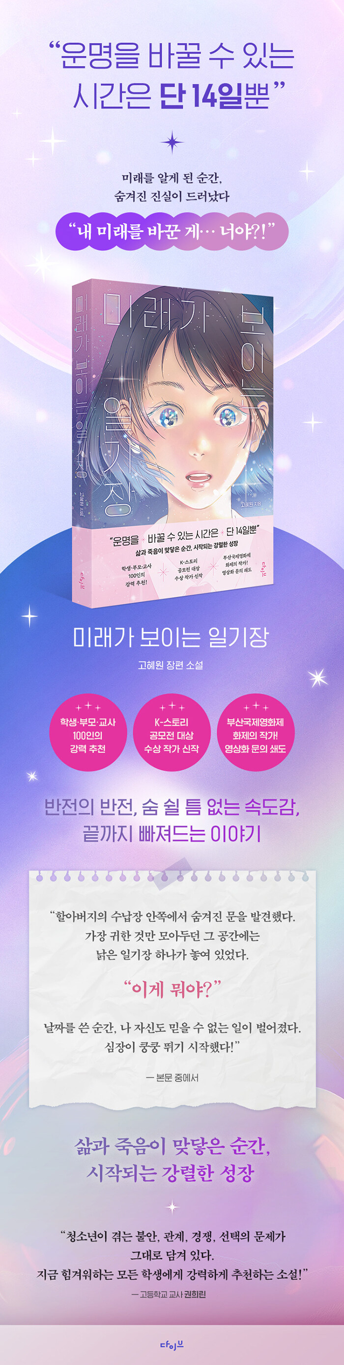 ¡¶¹Ì·¡°¡ º¸ÀÌ´Â ÀϱâÀå¡·¿¡¼´Â »î°ú Á×À½ÀÇ °æ°è¿¡¼ ºñ·Î¼Ò ÀÚ½ÅÀÇ ¿À·£ »óó¸¦ Ä¡À¯Çϰí, ÇöÀ縦 ÅëÇØ ½º½º·Î ¹Ì·¡¸¦ ±¸Çس»°Ô µÈ û¼Ò³âµéÀÇ ´«ºÎ½Å ¼ºÀåÀÌ ÆîÃÄÁø´Ù. ¹ÝÀü¿¡ ¹ÝÀüÀ» °ÅµìÇÏ´Â ³»¿ë°ú 10´ëÀÇ Çö½ÇÀûÀÎ ¹®Á¦¸¦ ³¯Ä«·Ó°Ô Æ÷ÂøÇÏ¸ç ¿µ¾î´úÆ®, ÆÇŸÁö, ¹Ì½ºÅ͸®ÀÇ À帣Àû Äè°¨À» µ¿½Ã¿¡ ¸¸Á·½ÃŰ´Â ÀÌ ÀÛǰÀº, ù ÀåÀ» ÆîÄ¡´Â ¼ø°£ ´Ü¼û¿¡ Èì»¶ ºüÁ® Àд ¡®¾ÐµµÀûÀÎ ¸ôÀÔ°¨¡¯À» ¼±»çÇÒ °ÍÀÌ´Ù.
