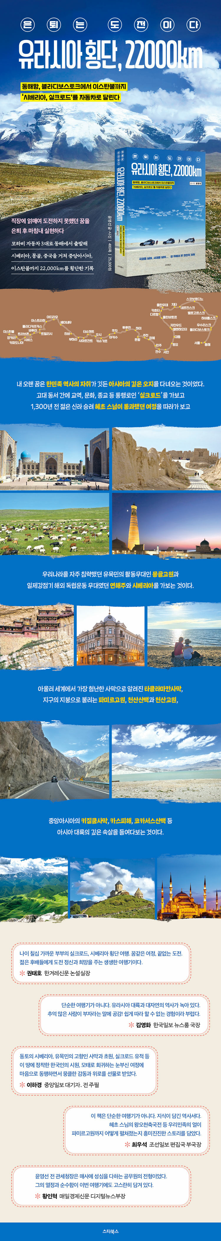 ¡ºÀ¯¶ó½Ã¾Æ Ⱦ´Ü, 22000km¡»´Â ÀºÅð ÈÄ µµÀüÀÌ´Ù. ÀÌ Ã¥Àº ¿ì¸® ÇѹÎÁ·ÀÇ ¹ßÀÚÃ븦 µû¶ó ½Ãº£¸®¾Æ, ¹ÙÀÌĮȣ¼ö, ½ÇÅ©·Îµå¿Í À¯¶ó½Ã¾Æ¿¡ Á¸ÀçÇϰí ÀÖ´Â ¿ª»ç¿Í ¹®È¸¦ È®ÀÎÇÏ°í ±àÁö¸¦ °¡Áú ¼ö ÀÖ´Â À¯ÄèÇÑ ¿©Çà¼ÀÌÀÚ ¹®È¿¹¼úÀ» ¸Á¶óÇÏ´Â ¿ª»ç¼¶ó ÇÒ ¼ö ÀÖ´Ù. À¯¶ó½Ã¾Æ Ⱦ´ÜÀ» ÀÚµ¿Â÷¸¦ °¡Áö°í ÃÖÃÊ·Î ÇÏ´Ù º¸´Ï ÀÚµ¿Â÷¸¦ °¡Áö°í Áß±¹¿¡´Â ¸ù°ñ ÅëÇØ¼¸¸ µé¾î°¥ ¼ö ÀÖ°í Áß±¹ ¿îÀü¸éÇãÁõ¸¸ Åë¿ëµÇ´Â µî ÇàÁ¤ÀûÀÎ ÀýÂ÷¿¡ ¸¹Àº ¾î·Á¿òÀ» °Þ¾úÁö¸¸, ¸¶Áö¸· ¿©ÇàÁö À̽ºÅººÒ¿¡ ÅäÂøÇØ¼´Â ³¯¾Æ°¥ °Í °°Àº ±âºÐÀ¸·Î Ⱦ´Ü ¿©ÇàÀ» ¸¶Ä¡°í Ȧ°¡ºÐÇÑ ¸¶À½À¸·Î È޽İú À̽ºÅººÒ ¿©Çà°ú Áñ±â°í Â÷´Â ¹è·Î º¸³»°í ³ª¼ ±Í±¹Çؼ ÀÏ ³â µ¿¾È ¿ø°í¸¦ Á¤¸®Çß´Ù.