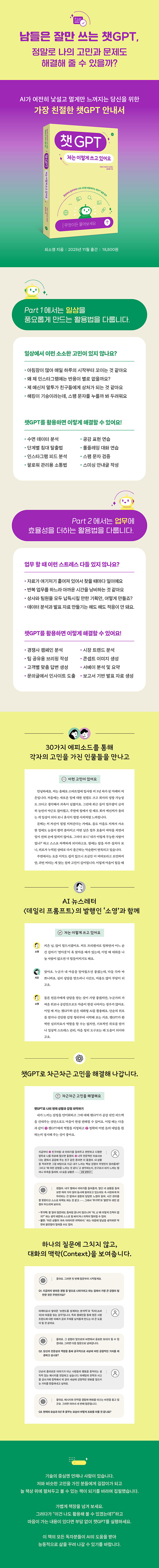 ÀÌ Ã¥Àº êGPT¸¦ ºñ·ÔÇÑ ´Ù¾çÇÑ »ý¼ºÇü AI ÅøÀ» ´Ù¾çÇÑ »óȲ¿¡¼ Ȱ¿ëÇÏ´Â ¹æ¹ýÀ» ¾È³»ÇÕ´Ï´Ù. 30°³ÀÇ ¿¡ÇǼҵ帶´Ù °¢ÀÚÀÇ °í¹ÎÀ» °¡Áø Àι°ÀÌ µîÀåÇØ, ÀúÀÚÀÌÀÚ »ý¼ºÇü AI Àü¹®°¡ ¡®¼Ò¿µ¡¯°ú ÇÔ²² ÀÚ½ÅÀÇ ¹®Á¦¸¦ êGPT·Î ÇØ°áÇØ ³ª°©´Ï´Ù. µîÀåÀι°µéÀÇ °í¹ÎÀº Çö´ëÀÎÀ̶ó¸é ´©±¸³ª °ø°¨ÇÒ ¼ö ÀÖ´Â ³»¿ëÀ¸·Î, À̸¦ ÅëÇØ ³¸¼³°í ¸Ö°Ô ´À²¸Áö´ø AI¸¦ ÇÑÃþ Ä£±ÙÇÏ°Ô °æÇèÇÒ ¼ö ÀÖ½À´Ï´Ù.
