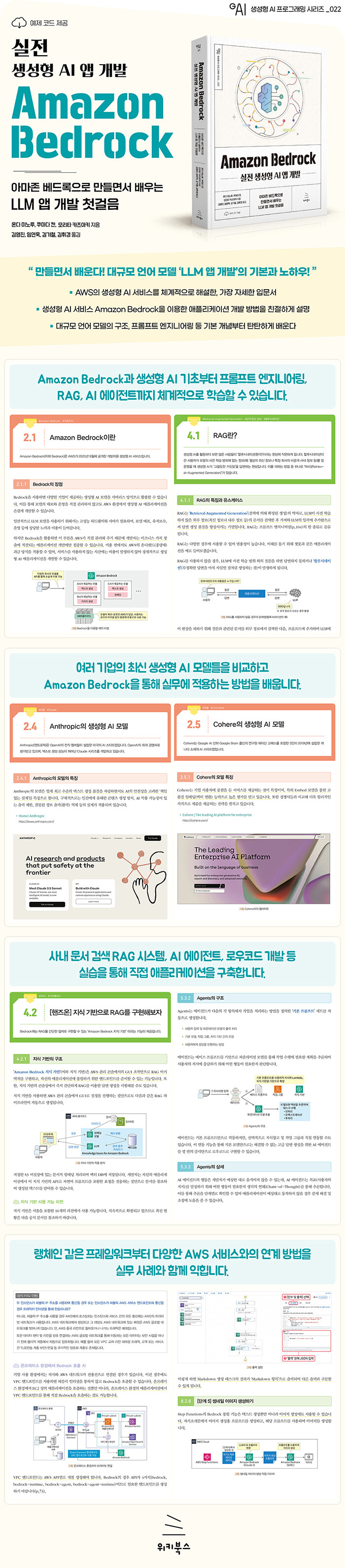 ¾Æ¸¶Á¸ º£µå·Ï(Amazon Bedrock)Àº AWSÀÇ °·ÂÇϰí À¯¿¬ÇÑ ±â¹Ý ¸ðµ¨(Foundation Model) ¼ºñ½º´Ù. ¾Æ¸¶Á¸ º£µå·ÏÀ» Ȱ¿ëÇÏ¿© »ý¼ºÇü AI ¾ÖÇø®ÄÉÀ̼ÇÀ» ½ÇÁ¦·Î ¼³°èÇÏ°í ±¸ÃàÇÏ´Â µ¥ ÇÊ¿äÇÑ ¸ðµç °ÍÀ» ´ã¾Æ³Â´Ù. ±âº»ÀûÀÎ AI Áö½ÄºÎÅÍ ½ÃÀÛÇÏ¿©, Bedrock ȯ°æ ¼³Á¤, ´Ù¾çÇÑ ¸ðµ¨ »ç¿ë¹ý, ½ÇÁ¦ ºñÁî´Ï½º¿¡ Àû¿ëÇÒ ¼ö ÀÖ´Â ¾ÖÇø®ÄÉÀÌ¼Ç ±¸Çö±îÁö ´Ü°èº°·Î ¾È³»ÇÑ´Ù.