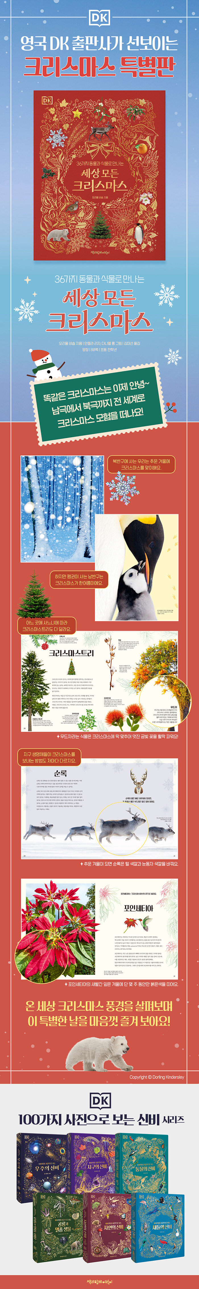ÀÌó·³ ¡¶DK ¼¼»ó ¸ðµç Å©¸®½º¸¶½º¡·´Â ³ÐÀº ½Ã°¢À¸·Î Àü ¼¼°è ¿©·¯ Áö¿ªÀÇ Å©¸®½º¸¶½º dz°æÀ» ¼Ò°³ÇÏ´Â ÇÑÆí, ±×¿Í °ü·ÃµÈ µ¿½Ä¹°ÀÇ ¸ô¶ú´ø »ç½ÇµéÀ» ¼Ò°³ÇÑ´Ù. Å©¸®½º¸¶½º°¡ ´Ù°¡¿À¸é Æ®¸®¿Í ÇÔ²² ÈçÈ÷ º¼ ¼ö ÀÖ´Â Æ÷Àμ¼Æ¼¾ÆÀÇ »õ»¡°£ ºÎºÐÀÌ ¾Ë°í º¸¸é ²ÉÀÌ ¾Æ´Ï¶ó, ²ÉÀ» °¨½Ñ Æ÷¿±À̶ó´Â Á¡, ¡®·çµ¹ÇÁ »ç½¿ ÄÚ¡¯¶ó´Â ij·²·Î Àͼ÷ÇÑ »êŸÀÇ ½ä¸Å¸¦ ²ô´Â µ¿¹°ÀÌ »ç½ÇÀº »ç½¿ÀÌ ¾Æ´Ï¶ó ¼ø·ÏÀ̶ó´Â »ç½Ç! ±×¸®°í ¼ø·ÏÀº °èÀý¸¶´Ù ´«µ¿ÀÚ »ö±òÀ» ¹Ù²Û´Ù´Â Á¡ µî Èï¹Ì·Î¿î »ç½ÇµéÀ» ¾Ë ¼ö ÀÖ´Ù. ÇÑÆíÀ¸·Î´Â °Å¹ÌÁÙ, ¸äµÅÁö, °í¾çÀÌ¿Í °°ÀÌ ¾ð¶æ º¸¸é Å©¸®½º¸¶½º¿Í ÀüÇô »ó°ü¾ø¾î º¸À̴ Ű¿öµåµµ µîÀåÇϴµ¥, ¾Ë¼ö·Ï ½Å±âÇÏ°í °æÀ̷οî ÀÚ¿¬ÀÇ ¼¼°è¸¦ Å©¸®½º¸¶½º¶ó´Â ¼³·¹°í Èï¹Ì·Î¿î ÁÖÁ¦¿Í ¿¬°á½ÃÄÑ Ç®¾î ³½ Á¡ÀÌ ÀλóÀûÀÌ´Ù.
