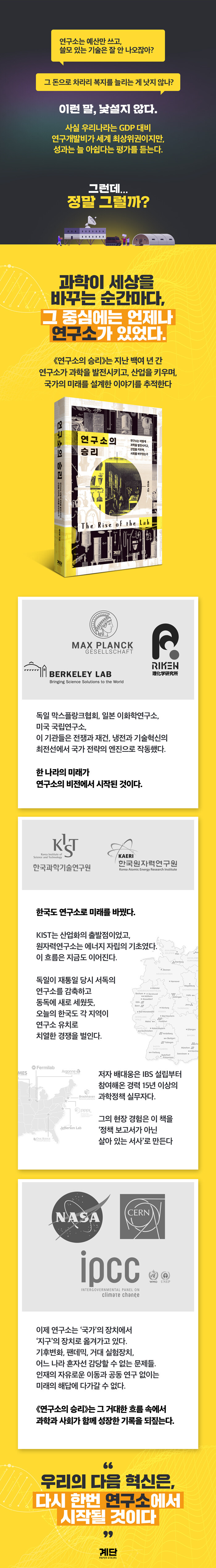 ¿¬±¸¼Ò¸¦ ÀÌÇØÇÏ´Â ÀÏÀº ½ÇÇè Àåºñ ¸ñ·ÏÀ̳ª ¿¬±¸ ¼º°ú ¸®½ºÆ®¸¦ º¸´Â °Í ±× ÀÌ»óÀÌ´Ù. ±³À°, »ê¾÷, Á¤Ä¡Àû ¼±Åðú ÀÎÀçÀÇ È帧Àº ¹°·Ð ±¹°¡ÀÇ ºñÀü±îÁö ¾ôÈù º¹ÇÕÀû ÀåÄ¡¸¦ Àоî¾ß ÇÑ´Ù. ¡¶¿¬±¸¼ÒÀÇ ½Â¸®¡·´Â ÀÌ ÀåÄ¡°¡ ¾î¶»°Ô »ý°Ü³µ°í, ¿À´Ã ³¯ ¿Ö ´õ Áß¿äÇØÁ³´ÂÁö¸¦ ¼¼°èÀÇ ¿ª»ç¿Í ±â¼ú °æÀïÀÇ È帧 ¼Ó¿¡¼ ±¸Ã¼ÀûÀ¸·Î º¸¿©ÁØ´Ù.