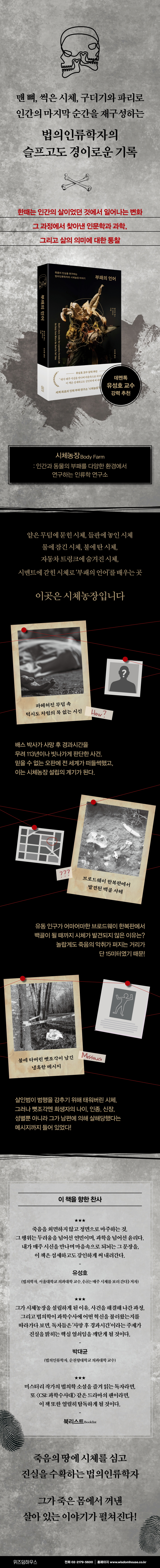 ÀÌ Ã¥ÀÇ °¡Àå Å« ¹Ì´öÀº ½½ÇÁ°íµµ °æÀ̷οî ÀúÀÚÀÇ °æÇè´ãÀ» ÅëÇØ¼ »À ÇØºÎÇÐ, ¹ýÀǰïÃæÇÐ, ÀÎü ºÎÆÐ ¿¬±¸ µî ¹ýÀÇÀηùÇÐÀÌ »õ·Ó°Ô °³Ã´Çس½ Çй®ÀÇ ¿µ¿ªµé, ±×¸®°í Á×Àº Àΰ£ÀÌ °ÞÀº »ç¸ÁÀÇ Á¾·ù¿Í »ç¸Á ÈÄ °æ°ú½Ã°£, ±×¸®°í »ç¸ÁÇÑ È¯°æÀ» ÆÇº°ÇÏ´Â ¿¬±¸°¡ ¹ßÀüÇÏ´Â °úÁ¤À» ¾Ë°Ô µÈ´Ù´Â °ÍÀÌ´Ù. ´õÇÏ¿© ÀúÀÚÀÇ »À ÇØºÎÇÐ ¼³¸í°ú ºÎ·Ï¿¡ ´ã±ä °ñ°Ý ÀÏ·¯½ºÆ®¸¦ º¸°í ³ª¸é, µ¶ÀÚ ¶ÇÇÑ Èñ»ýÀÚÀÇ ³ªÀÌ, ÀÎÁ¾, ¼ºº°, ½ÅÀåÀ» ÆÇº°ÇÒ ¼ö ÀÖ°Ô µÇ´Â ¹ýÀÇÇÐÀÇ ¡®±³¾ç¡¯À» ¾òÀ» ¼ö ÀÖ´Ù.