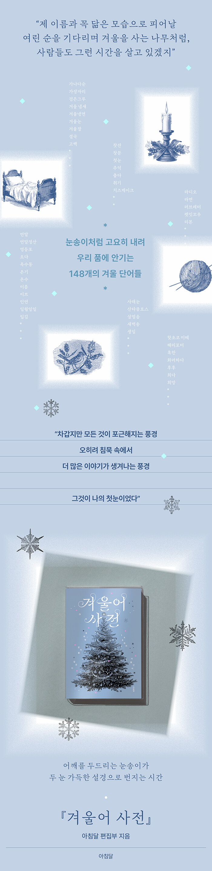 ¡®°ËÀº±×·ç, °Ü¿ï´«, °Ü¿ïÀá, ´«»ç¶÷, ¹æÇнÄ, º¸Ç®, ¼ºÅº, ÀÔ±è, ÄÚÆ®¡¦¡¦¡¯ °Ü¿ï ÇÏ¸é ±Ý¼¼ ¶°¿Ã¸± ¼ö ÀÖ´Â ´Ü¾îµéÀº ´©±º°¡ÀÇ ±â¾ïÀ¸·ÎºÎÅÍ À籸¼ºµÇ¾î »õ·Î¿î ¾ó±¼À» ºúÀ¸¸ç À̾߱Ⱑ µÈ´Ù. ¶ÇÇÑ, ¡®°¡³ª´Ù¼ø, °Ü¿ï¿¡ ÀÛ¾ÆÁö´Â »ç¶÷µéÀÇ ¸ðÀÓ, °øÇ×, ´ë°ü¶÷Â÷, Àẹ¼Ò, Ä«¸Þ¶ó¡¯ µî °Ü¿ïÀ» ÀÔ°í »õ·Ó°Ô Àǹ̰¡ µÇ¾î°¡´Â ´Ü¾îµé±îÁö ´Ùä·Ó°Ô ¼ö·ÏµÇ¾ú´Ù. ±âȹÀÇ ¸»ÀÇ Á¦¸ñ ¡¸´«Àº º¸¸®ÀÇ À̺ÒÀÌ´Ù¡¹´Â ¼Ó´ãÀ¸·Î, °Ü¿ï µ¿¾È ³»¸° ´«ÀÌ º½¿¡ ½ÏÆ·¿ï º¸¸®¸¦ °¡¹°Áö ¾Ê°Ô ÇÑ´Ù´Â Àǹ̸¦ Áö´Ï°í ÀÖ´Ù. ¡º°Ü¿ï¾î »çÀü¡»Àº ¿ì¸®°¡ °£Á÷Çϰí ÀÖ´Â ´Ü¾îµéÀÌ, ¾ðÁ¨°¡ ¸¶À½À» °¡¹°Áö ¾Ê°í Æ÷±ÙÈ÷ µ¤¾îÁÖ´Â ´« À̺ÒÀÌ µÉ ¼ö ÀÖÁö ¾ÊÀ»±î ÇÏ´Â ¸¶À½À¸·Î ¿«Àº °ÍÀÌ´Ù. ±âȹÀÇ ¸»¿¡¼Ã³·³ »çÀüÀº ¡°¿¾îº¸Áö ¾ÊÀ¸¸é ¾Æ¹«°Íµµ µé·ÁÁÖÁö ¾Ê´Â Ã¥, ±×·¯³ª ´Ü¾î¸¦ µÎµå¸®¸é ¿ì¸®°¡ ¾Æ´Â °Íº¸´Ù ÈξÀ ´õ ¸¹Àº À̾߱Ⱑ ½ñ¾ÆÁö´Â Ã¥¡±ÀÌ´Ù. ´Ü¾î¿¡¼ ½ÃÀÛÇØ Ãß¾ïÀÌ ¾ôÈù Àå¸éÀ» Áö³ª, Àǹ̸¦ Áã¾îº¼ ¼ö ÀÖ´Â ±Ã±ØÀûÀ¸·Î ÀÌ Ã¥À» ÅëÇØ ÇÔ²² º¸³»´Â °Ü¿ï ¼Ó¿¡¼, µ¶ÀÚµéÀÌ Àڱ⸸ÀÇ ´Ü¾î¸¦ ±Ã±¸ÇÏ°í °Ü¿ï¿¡ °üÇÑ ¾Æ¸§´Ù¿î Àǹ̸¦ Ž»öÇØº¼ ¼ö ÀÖ¾úÀ¸¸é ÁÁ°Ú´Ù.