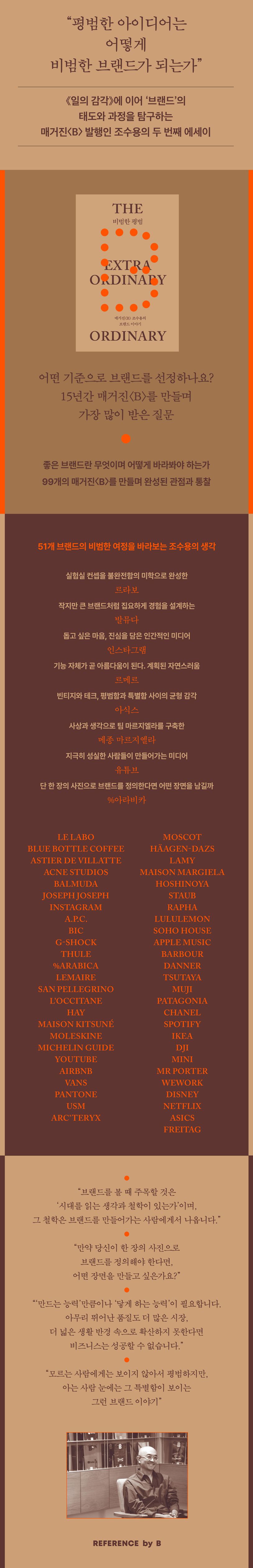 ¼ö¸¹Àº ºê·£µå°¡ ž°í »ç¶óÁö´Â ½Ã´ë, ¿ì¸®´Â ¹«¾ùÀ» ±âÁØÀ¸·Î ÁÁÀº ºê·£µå¸¦ ¾Ë¾Æº¼ ¼ö ÀÖÀ»±î? ¸Å°ÅÁø¡¶B¡·ÀÇ ¹ßÇàÀÎ Á¶¼ö¿ëÀº ÀÌ ±Ùº»ÀûÀÎ Áú¹®¿¡ ´äÇϱâ À§ÇØ 15³â°£ ºê·£µå¸¦ ޱ¸ÇÏ¸ç ¾òÀº ÅëÂûÀ» ´ãÀº ½Å°£ ¡¶ºñ¹üÇÑ Æò¹ü¡·À» Ãâ°£Çß´Ù. ÀÌ Ã¥Àº ±×ÀÇ ³¯Ä«·Î¿î ½Ã¼±À¸·Î Æ÷ÂøÇÑ 51°³ ºê·£µåÀÇ ºñ¹üÇÑ ¿©Á¤À» ÅëÇØ, ¿À´Ã³¯ ºê·£µåÀÇ º»Áú°ú ¹Ì·¡¿¡ ´ëÇÑ °üÁ¡À» Á¦½ÃÇÑ´Ù.