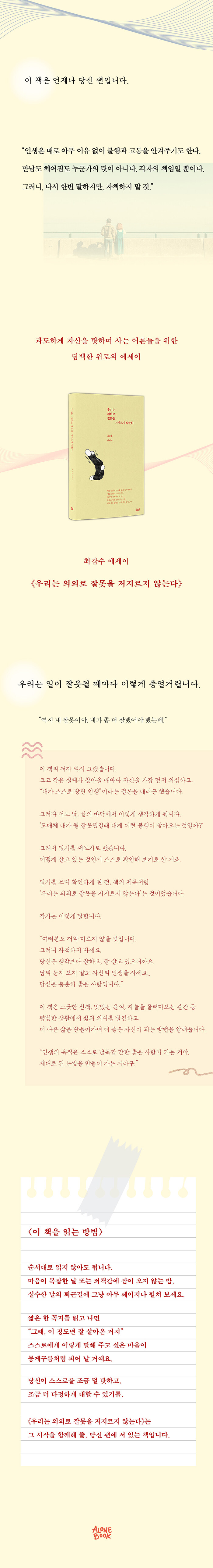 ¡¶¿ì¸®´Â ÀǿܷΠÀ߸øÀ» ÀúÁö¸£Áö ¾Ê´Â´Ù¡·´Â »ó½ÇÀÇ ¾ÆÇÄÀ» ³Ñ¾î ÀÏ»óÀÇ ±â»ÝÀ» ȸº¹Çϰí, ´õ ±í¾îÁø ³»¸éÀ» µé¿©´Ùº¸¸ç »îÀ» ¼º¼÷ÇÑ ½Ã¼±À¸·Î ¹Ù¶óº¸´Â ¿©Á¤À» ´ãÀº ¿¡¼¼ÀÌÀÔ´Ï´Ù.