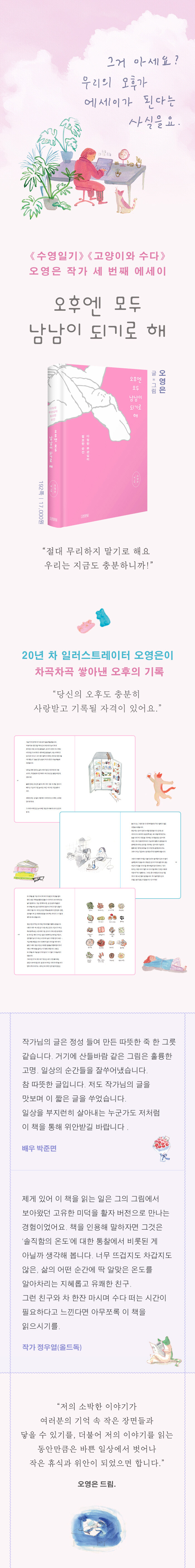 ÀüÀÛÀ» ÅëÇØ ¡®±Û°ú ±×¸² »çÀÌ¿¡ ¿©À¯°¡ È帣´Â ÀÛ°¡¡¯¶õ ÆòÀ» ¹ÞÀº ¿À¿µÀº ÀÛ°¡°¡ À̹ø¿¡´Â ¡®¿ÀÈÄ¡¯¸¦ ÁÖÁ¦·Î ¼¼ ¹øÂ° ¿¡¼¼À̸¦ ¼±º¸ÀÔ´Ï´Ù. °í¾çÀÌ¿Í ÇÔ²²ÇÑ Çѳ·ÀÇ ³ª¸¥ÇÑ ¿©À¯¿¡¼ºÎÅÍ, µ¿°æÇÏ´Â ÀÛ°¡ÀÇ ÃëÇâ¿¡ Àá°Ü ¸¶À½ÀÌ ºÎµå·´°Ô Èçµé¸®´ø ³¯, ÀÏ·¯½ºÆ®·¹ÀÌÅͷμ °ÞÀº Å©°í ÀÛÀº ¿¡ÇǼҵåµé ±×¸®°í ±×¿¡°Ô »©³õÀ» ¼ö ¾ø´Â ¼ö¿µÀå À̾߱⡤¡¤¡¤ ¸¶Ä¡ ¾Æ±âÀÚ±âÇÑ »çÅÁ ¹Ù±¸´Ïó·³ ´Ùä·Ó°í »ç¶û½º·¯¿î À̾߱Ⱑ °¡µæ ´ã±ä Ã¥ÀÔ´Ï´Ù. ÀÛ°¡´Â ¾Æ¹« Àϵµ ÀϾÁö ¾Ê¾Æ ¿ÀÈ÷·Á ´õ ÁÁÀº ¿ÀÈÄÀÇ ½Ã°£ ¼Ó¿¡¼ ¹®À帶´Ù ´À±ßÇÑ ¼û°á°ú µû¶æÇÑ ¿Â±â¸¦ ºÒ¾î³ÖÀ¸¸ç Æò¹üÇÑ ÇÏ·çÀÇ ¾Æ¸§´Ù¿òÀ» õõÈ÷ µÇ»õ±é´Ï´Ù. ÀÏ»ó ¼Ó »ç¶÷µéÀÇ Á¶¿ëÇÑ ¿ôÀ½°ú »ç¼ÒÇÑ ´ëÈ, ÇÞ»ì ¾Æ·¡ ¹øÁö´Â µÕ±×·± ±×¸²ÀÚ±îÁö ¿ì¸®¸¦ ¹Ì¼Ò Áþ°Ô ÇÏ´Â ¿Â±â°¡ ÇÑ ÆíÀÇ ¿¡¼¼À̰¡ µÈ´Ù°í ¸»ÇØÁÝ´Ï´Ù.