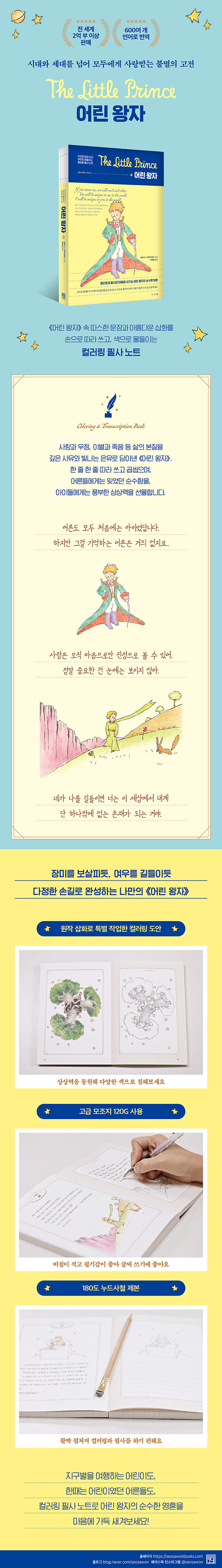 ¡¶¾î¸° ¿ÕÀÚ: ¼ÕÀ¸·Î µû¶ó ¾²°í, »öÀ¸·Î ¹°µéÀÌ´Â Ä÷¯¸µ ÇÊ»ç ³ëÆ®¡·´Â µ¶Àڵ鿡°Ô ´õ¿í Æø³ÐÀº ÇÊ»ç °æÇèÀ» ¼±»çÇϱâ À§ÇØ Æ¯º°È÷ ±âȹµÇ¾ú´Ù. ¾Æ¸§´Ù¿î À̾߱â¿Í ÇÔ²² »ýÅØÁãÆä¸®°¡ Á÷Á¢ ±×¸° »ðȷεµ ³Î¸® ¾Ë·ÁÁø ¡¶¾î¸° ¿ÕÀÚ¡·ÀÇ ¸Å·ÂÀ», À̹ø Ã¥¿¡¼´Â ¡®Çʻ硯¿Í ¡®Ä÷¯¸µ¡¯À̶ó´Â »õ·Î¿î ¹æ½ÄÀ¸·Î ¸¸³¯ ¼ö ÀÖ´Ù. ¸ÕÀú Ã¥ ¼Ó¿¡´Â ¿øÀÛ »ðȸ¦ ¹ÙÅÁÀ¸·Î Á¦ÀÛÇÑ Ä÷¯¸µ µµ¾ÈÀ» ¼ö·ÏÇØ Â÷º°Á¡À» µÎ¾ú´Ù. ¿øÀÛÀÇ »ö°¨À» Âü°íÇØ µû¶ó Ä¥ÇÒ ¼öµµ ÀÖ°í, ÀڽŸ¸ÀÇ °¨°¢À» ´õÇØ ¼¼»ó¿¡ Çϳª»ÓÀÎ ¡®³ª¸¸ÀÇ ¾î¸° ¿ÕÀÚ¡¯¸¦ ¿Ï¼ºÇÒ ¼öµµ ÀÖ´Ù. ä»öµÈ ¿øº» ±×¸²°ú ¹Ø±×¸² µµ¾ÈÀ» ÇÔ²² Á¦°øÇØ, µ¶ÀÚµéÀº ¿øÇÏ´Â ¹æ½ÄÀ¸·Î ÀÚÀ¯·Ó°Ô Âü¿©ÇÒ ¼ö ÀÖ´Ù.
