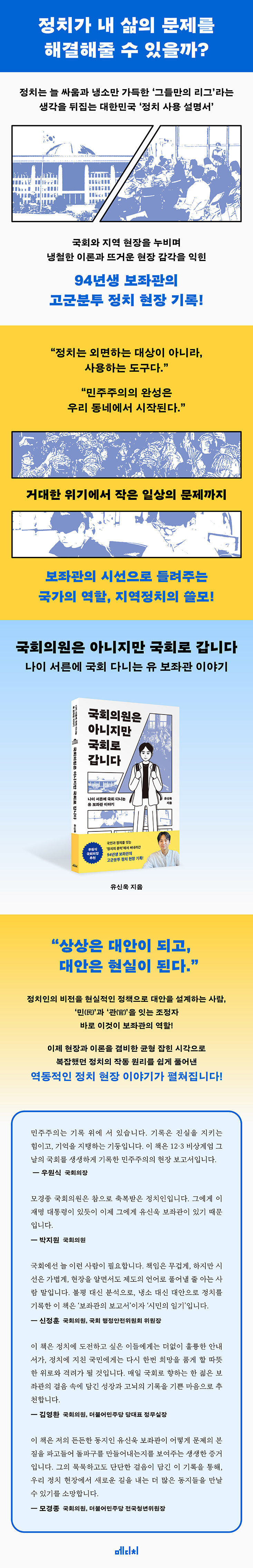 ¸¸¾à Á¤Ä¡°¡ ¿ì¸®°¡ ¿Ü¸éÇØ¾ß ÇÒ ´ë»óÀÌ ¾Æ´Ï¶ó, ³» »îÀÇ ´ç¸éÇÑ ¹®Á¦¸¦ Ǫ´Â °¡Àå Çö½ÇÀûÀÎ ¡®µµ±¸¡¯¶ó¸é ¾î¶»°Ô »ç¿ëÇØ¾ß ÇÒ±î? ÀÌ Ã¥Àº ±¹È¸¿Í Áö¿ª ÇöÀåÀ» ´©ºñ¸ç, Â÷°¡¿î À̷аú ¶ß°Å¿î ÇöÀå °¨°¢À» ÀÍÇô°£ 94³â»ýÀÇ ÀþÀº º¸Á°üÀÇ °í±ººÐÅõ Á¤Ä¡ ÇöÀå ±â·ÏÀ» ÅëÇØ ±× ´äÀ» µé·ÁÁØ´Ù. ¾¾½Ç°ú ³¯½Çó·³ Á¤±³ÇÏ°Ô ¿«¾î³½ ¡®º¸Á°üÀÇ º¸°í¼ÀÌÀÚ ½Ã¹ÎÀÇ Àϱ⡯ÀÎ ÀÌ Ã¥Àº º¸Á°üÀÇ Á÷¾÷¼¼°è¸¦ µé·ÁÁÖ´Â °Í¿¡¼ ÇÑ °ÉÀ½ ´õ ³ª¾Æ°¡ Á¤Ä¡¿¡ µµÀüÇÏ°í ½ÍÀº À̵鿡°Ô´Â ´õ¾øÀÌ ÈǸ¢ÇÑ ¾È³»¼ ¿ªÇÒÀ» ÇÑ´Ù.