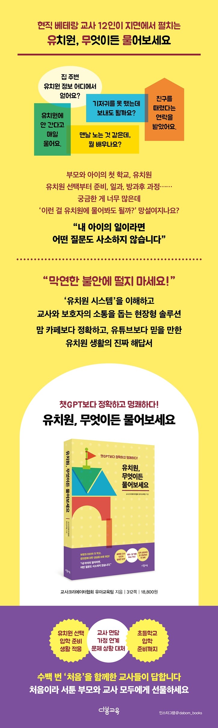ÀÌ Ã¥ÀÇ °¡Àå Å« ¸Å·ÂÀº ºÎ¸ð°¡ ¡°ÀÌ·± °Íµµ À¯Ä¡¿ø¿¡ ¹°¾îºÁµµ µÉ±î?¡± ¸Á¼³¿´´ø Áú¹®¿¡ ÇöÁ÷ ±³»çµéÀÌ ¸íÄèÇÏ°Ô ´äÇÑ´Ù´Â Á¡ÀÌ´Ù. ±âÀú±Í¸¦ ¶¼Áö ¸øÇÑ ¾ÆÀ̸¦ À¯Ä¡¿ø¿¡ º¸³»µµ µÉÁö, Ä£±¸¸¦ ¶§¸®°Å³ª Áý¿¡¼ ¾²Áö ¾Ê´Â ³ª»Û ¸»À» ¹è¿ö¿ÔÀ» ¶§ ¾î¶»°Ô ÇØ¾ß ÇÒÁö, ÀüÇÐÀ» °í·ÁÇÒ ¶§ ¹«¾ùÀ» È®ÀÎÇØ¾ß ÇÒÁö, À¯Ä¡¿ø¿¡¼ »ç¿ëÇÏ´Â µðÁöÅÐ ±â±â Ȱ¿ëÀÇ ÀÌÀ¯¿Í È¿°ú´Â ¹«¾ùÀÎÁö, ¹ß´Þ ¼Óµµ°¡ ´À¸° ¾ÆÀ̸¦ ¾î¶»°Ô µµ¿Í¾ß ÇÒÁö µî ÁÖº¯¿¡ ½±°Ô ¹¯±â ¾î·Á¿î °í¹Î°ú ±Ã±ÝÁõÀ» ½ÇÁ¦ »óȲ Áß½ÉÀ¸·Î ¾ËÂ÷°Ô Ç®¾î³Â´Ù.