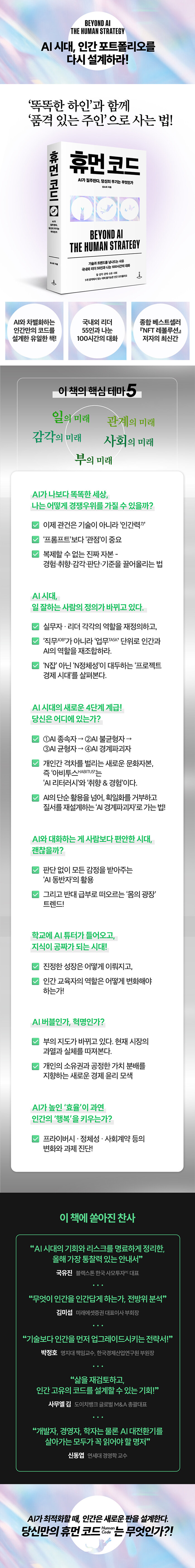 ÀÌ Ã¥Àº AIÀÇ ºü¸¥ ÁøÈ¿Í ±×·Î ÀÎÇÑ °æÁ¦¡¤»çȸ º¯È»óÀ» »ý»ýÇÏ°Ô Â¤¾î°¡¸ç, ±× ¼Ó¿¡¼ ¿ì¸®µé °¢ÀÚ´Â »îÀÇ Æ÷Æ®Æú¸®¿À¸¦ ¾î¶»°Ô Àç¼³°èÇØ¾ß ÇÒÁö, ÀÏ¡¤°¨°¢¡¤°ü°è¡¤¼ÒÀ¯¡¤»çȸ 5°¡Áö °üÁ¡¿¡¼ ±×·Á°£´Ù. ±¹³»¿Ü ¸®´õ 55Àΰú ³ª´« 100½Ã°£ÀÇ ´ëȸ¦ ³ì¿©³¿À¸·Î½á AI ½Ã´ëÀÇ ±¸Ã¼ÀûÀÎ »ýÁ¸¹ýÀ» Àü¹æÀ§·Î Ž»öÇÑ´Ù.