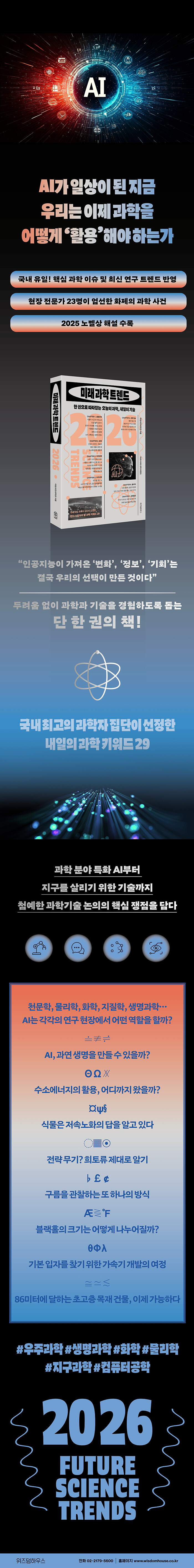 ÀΰøÁö´É¿¡¼ Áö±¸°úÇбîÁö, °ÅÀÇ ¸ðµç ºÐ¾ßÀÇ ¡®ÃֽŠÇÙ½É Á¤º¸¡¯¸¦ ÇÑ ±ÇÀ¸·Î ¸¸³´Ù. ¸Å³â ´õÇØÁö´Â ¡®¹Ì·¡ °úÇÐ Æ®·»µå¡¯ ½Ã¸®Áî´Â ¿ì¸®°¡ ´ç¸éÇÑ Ã·´Ü ±â¼úÀÇ ¸í¾ÏÀº ¹°·Ð ´Ù¾çÇÑ °úÇÐÀÇ ¹è°æÁö½ÄÀ» µÎ·ç ¤´Â °ÍÀÌ Æ¯Â¡ÀÌ´Ù. ƯÈ÷ À̹ø ¡¶2026 ¹Ì·¡ °úÇÐ Æ®·»µå¡·´Â ÀÌ¹Ì ÀÏ»ó ±í¼÷ÀÌ ÀÚ¸®ÇÑ AIÀÇ À¯¿ë¼º»Ó ¾Æ´Ï¶ó ½ÇÁ¦·Î °úÇÐÀÚµéÀÌ ¿¬±¸½Ç¿¡¼ ÀΰøÁö´ÉÀ» ¾î¶² ¹æ½ÄÀ¸·Î Ȱ¿ëÇÏ´ÂÁö¿¡ ´ëÇØ¼µµ »ìÆìº¼ ¼ö ÀÖ´Â À¯ÀÏÇÑ Ã¥ÀÌ´Ù. ¶ÇÇÑ ±âÈÄÀ§±â¿¡ ´ëóÇϱâ À§ÇÑ Ã·´Ü °úÇбâ¼ú ¼Ò½Ä°ú ±× ½Ã¹ü ¿î¿µ ÇöÀå±îÁö ¹ßºü¸£°Ô ´ã¾Ò´Ù. ½ÃÀǼº°ú Àü¹®¼ºÀ» ³õÄ¡Áö ¾Ê´Â ¡®¹Ì·¡ °úÇÐ Æ®·»µå¡¯·Î 2026³âÀ» Àå½ÄÇÒ Å°¿öµå¸¦ ½±°í Àç¹ÌÀÖ°Ô Àд´Ù.