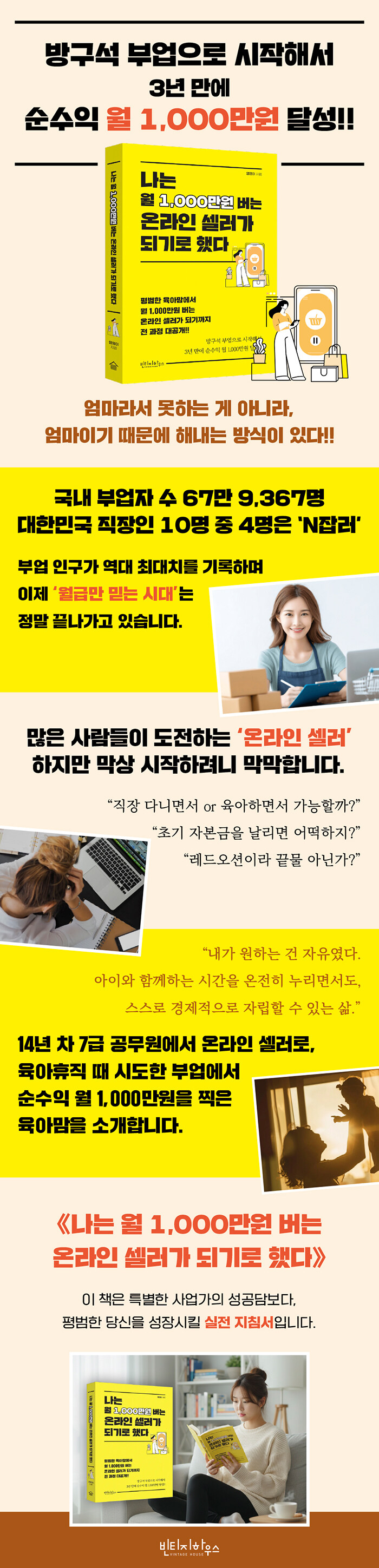 ¡¶³ª´Â ¿ù 1,000¸¸¿ø ¹ö´Â ¿Â¶óÀÎ ¼¿·¯°¡ µÇ±â·Î Çß´Ù¡·´Â Æò¹üÇÑ À°¾Æ¸¾ÀÌ À°¾ÆÈÞÁ÷À» ±âȸ »ï¾Æ ¿Â¶óÀÎ ¼¿·¯¸¦ ½ÃÀÛÇϰí, ¼º°ø°ú ÁÂÀý ³¡¿¡ ÀڽŸ¸ÀÇ ¿Â¶óÀÎ ÆÇ¸Å ³ëÇϿ츦 ±¸ÃàÇÏ´Â ¸ðµç °úÁ¤À» ´ã°í ÀÖ½À´Ï´Ù. ÀÌ Ã¥ÀÇ ÀúÀÚ´Â ¸»ÇÕ´Ï´Ù. ¡°¾ö¸¶¶ó¼ ¸øÇÏ´Â °Ô ¾Æ´Ï¶ó, ¾ö¸¶À̱⠶§¹®¿¡ ÇØ³»´Â ¹æ½ÄÀÌ ÀÖ´Ù!¡± ÀÌ Ã¥Àº °¡Á·ÀÇ Á» ´õ ³ªÀº »îÀ» ²Þ²Ù´Â À°¾Æ¸¾µé¿¡°Ô Èñ¸Á°ú ÇÔ²² ³ª¾Æ°¥ ±æÀ» ¾Ë·ÁÁÖ´Â ÀÛÀº ³ªÄ§¹ÝÀÌ µÉ °ÍÀÔ´Ï´Ù.