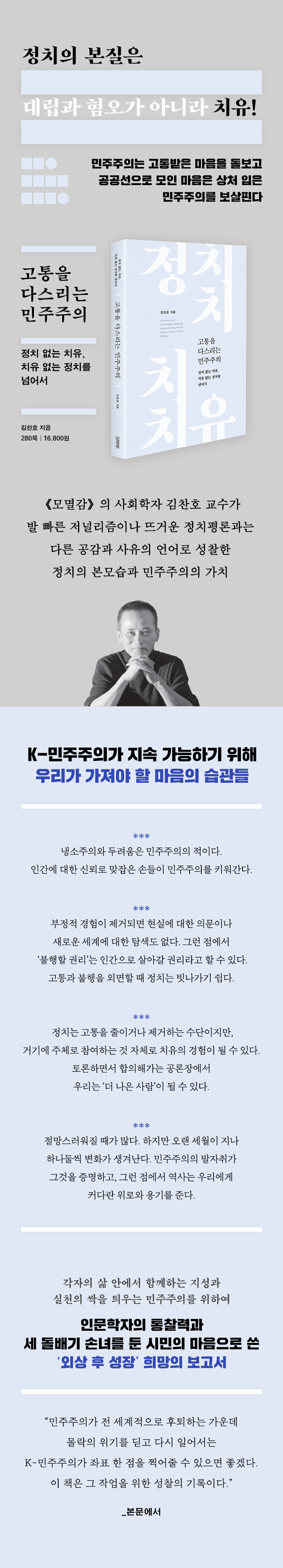 º¹ÇÕ À§±âÀÇ ½Ã´ë, Á¤Ä¡´Â »õ·Ó°Ô ž ¼ö ÀÖÀ»±î? ¹ÎÁÖÁÖÀÇ´Â ¾î¶»°Ô °í¸³µÈ »îµéÀ» ¿¬°áÇØ ¸¶À½ÀÇ °øµ¿Ã¼¸¦ ÀÌ·ê ¼ö ÀÖÀ»±î? ÀÌ Ã¥Àº ±èÂùÈ£ ±³¼ö°¡ 40³â »çȸÇÐ ¿¬±¸¿Í 60³â »îÀÇ °æÇèÀ» ¹ÙÅÁÀ¸·Î ¾´ µû¶æÇϰí Ä£ÀýÇÑ ¹ÎÁÖÁÖÀÇ »ç¿ë¼³¸í¼´Ù. 2024³â 12¿ù 3ÀÏ ºñ»ó°è¾ö »çÅ ÀÌÈÄ È¥¶õÇÑ Á¤±¹ ¼Ó¿¡¼ ÀúÀÚ´Â ±¤Àå°ú ¿¬±¸½ÇÀ» ¿À°¡¸ç Á¤Ä¡ÀÇ º»Áú°ú ¹ÎÁÖÁÖÀÇÀÇ ¿ø¸®¸¦ ޱ¸Çß´Ù. ¿À·£ ±â°£ ÃàÀûÇÑ ÇÐÀÚÀû Áö¼º°ú ½Ã¹ÎÀû ½ÇõÀ¸·Î Á¤Ä¡ÀÇ Á¸Àç ÀÌÀ¯´Â ´ë¸³°ú Çø¿À°¡ ¾Æ´Ï¶ó Ä¡À¯¿Í °øÁ¸À̸ç, ¹ÎÁÖÁÖÀÇ´Â ±× ÀÚü·Î Ä¡À¯ÀÇ ¿øÃµÀÌ µÉ ¼ö ÀÖÀ½À» ¹àÈù´Ù.