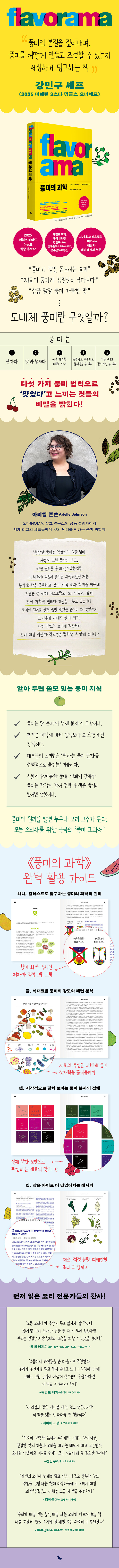 ¡°Ç³¹Ì´Â ¸À ºÐÀÚ¿Í ³¿»õ ºÐÀÚÀÇ Á¶ÇÕ¡±À̶ó´Â °¡Àå Áß¿äÇÑ ¹ýÄ¢À¸·Î ½ÃÀÛÇØ §¸À, ½Å¸À, ´Ü¸À, °¨Ä¥¸À, ¾´¸À¿¡ À̸£´Â Çô·Î ´À³¥ ¼ö ÀÖ´Â ´Ù¼¸ °¡Áö ¸ÀÀÇ °¨°¢(¹Ì°¢)°ú ÄÚ·Î ´À³¥ ¼ö ÀÖ´Â ¼ö¸¸ °¡Áö ³¿»õÀÇ ÆÐÅÏ(Èİ¢)À» Åä´ë·Î dz¹ÌÀÇ ÀÛµ¿ ¹æ½ÄÀ» ¸íÄèÇÏ°Ô ´Ù·é´Ù. ¿©±â¿¡ ¿ºÐÇØ, ¸¶À̾߸£ ¹ÝÀÀ, ¹ßÈ¿, ¼÷¼º°ú °°Àº ¸íΏ¸À¸·Î´Â º¹ÀâÇÏ°í ¾î·Æ±â¸¸ Çß´ø ¿ä¸® °úÇÐÀÇ ¼¼°è¸¦ ÆÄ°íµé¸ç dz¹Ì¸¦ ÃßÃâÇÏ°í ³óÃàÇÏ´Â µîÀÇ ½ÇÁúÀûÀÎ Á¶¸®¹æ¹ý°ú ±× ¿ø¸®¸¦ ÀÌÇØÇÒ ¼ö ÀÖµµ·Ï µ½´Â´Ù. ¶ÇÇÑ ÀúÀÚ°¡ Á÷Á¢ ±×¸° ½ÄÀç·á ÀÏ·¯½ºÆ®°¡ ¼ö·ÏµÇ¾î ÀÖ¾î Àç·áÀÇ °íÀ¯ ¼ººÐ°ú ¸ÀÀ» ÀÏÀ¸Å°´Â ºÐÀÚ¿¡ ´ëÇØ ½Ã°¢ÀûÀ¸·Î ÀÌÇØÇÒ ¼ö ÀÖ´Ù. ÀúÀÚ°¡ ½ÇÁ¦·Î ¸¸µé¾îº¸°í ¸Ô¾îº¸¸ç Á¤¸®ÇÑ Ç³¹Ì¸¦ ±Ø´ëÈÇÏ´Â 90¿© °¡Áö ·¹½ÃÇǸ¦ ÅëÇØ ÀÛÀº Â÷À̷Πdz¼ºÇÑ ¸ÀÀ» ³»´Â ¿ä¸®ÀÇ ±â¼ú±îÁö ¼Õ½±°Ô Å͵æÇÒ ¼ö ÀÖ´Ù.