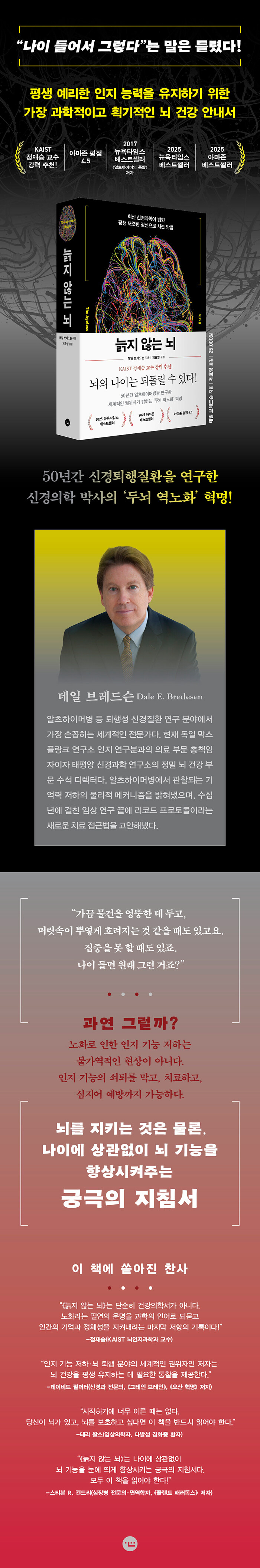 2025³â ´º¿åŸÀÓ½º º£½ºÆ®¼¿·¯ÀÌÀÚ ¾Æ¸¶Á¸ º£½ºÆ®¼¿·¯ÀÎ ½Å°£ ¡¶´ÄÁö ¾Ê´Â ³ú(The Ageless Brain: How to Sharpen and Protect Your Mind for a Lifetime)¡·ÀÇ ÀúÀÚ µ¥ÀÏ ºê·¹µå½¼Àº ¡°³ªÀ̵é¾î¼ ±×·¸´Ù¡±´Â ¸»Àº Ʋ·È´Ù°í ¼±¾ðÇÑ´Ù. µ¥ÀÏ ºê·¹µå½¼Àº 50³â ÀÌ»ó Ä¡¸Å³ª ¾ËÃ÷ÇÏÀ̸Ӻ´°ú °°Àº ½Å°æÅðÇàÁúȯÀ» ¿¬±¸ÇÑ ¼¼°èÀûÀÎ ±ÇÀ§ÀÚ´Ù. ±×´Â ÀÌ Ã¥¿¡¼ ³ëÈ´Â °áÄÚ ÀÚ¿¬½º·¯¿î Çö»óÀÌ ¾Æ´Ï¸ç, ³ªÀ̰¡ µé¸é ÀÎÁö ´É·ÂÀÌ ¶³¾îÁø´Ù´Â Åë³äÀ» ÃֽнŰæ°úÇÐ ¿¬±¸ °á°ú¸¦ ¹ÙÅÁÀ¸·Î ¹Ý¹ÚÇÑ´Ù. ¾ËÃ÷ÇÏÀ̸Ӻ´À» ºñ·ÔÇÑ ½Å°æÅðÇàÁúȯÀº °É¸®±â Àü¿¡µµ ¿¹¹æ °¡´ÉÇÏ´Ù. ÀÌ¹Ì º´ÀÌ ÁøÇàµÆ´Ù¸é ÁøÇà ¼Óµµ¸¦ ´ÊÃ߰ųª ±Øº¹ÇØ ´Ù½Ã ¿ø·¡ »óÅ·ΠµÇµ¹¸± ¼ö ÀÖ´Ù. ´õ ³ª¾Æ°¡ ³úÀÇ ¼ö¸í±îÁö ¿¬ÀåÇÒ ¼ö ÀÖ´Ù.