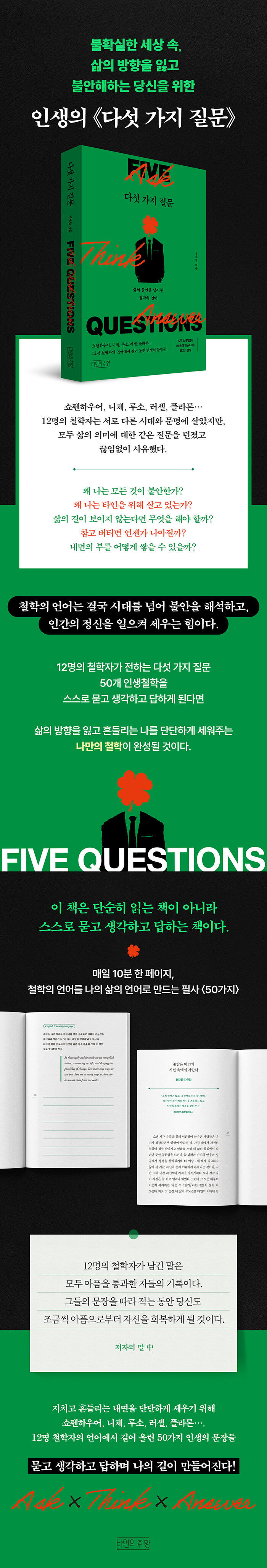 ¡¶´Ù¼¸ °¡Áö Áú¹®¡·Àº ÀλýÀ» »ì¾Æ°¡¸é¼ ¹Ýµå½Ã »çÀ¯ÇØ¾ß ÇÒ ´Ù¼¸ °¡Áö Áú¹®°ú ±×¿¡ ´ëÇÑ Ã¶ÇÐÀÚµéÀÇ Çý¾ÈÀ» ´ãÀº Ã¥ÀÌ´Ù. 2400³â ÀüÀÇ ±×µéµµ, Áö±Ý ÀÌ ½Ã´ë¸¦ »ç´Â Çö´ëÀεµ ²÷ÀÓ¾øÀÌ ¹¯°í °í¹ÎÇϴ ù ¹øÂ° Áú¹®Àº ¡®¿Ö ³ª´Â ¸ðµç °ÍÀÌ ºÒ¾ÈÇѰ¡?¡¯ÀÌ´Ù. ÀÌ Áú¹®À» ÅëÇØ ³» ¸¶À½ÀÇ ºÒ¾È°ú °íÅëÀÌ ¾îµð¿¡¼ ±âÀÎÇÏ´ÂÁö, ºÒÇà°ú ¿ª°æÀ» À̰ܳ»´Â ¹æ¹ýÀº ¹«¾ùÀÎÁö, ¿Ö ´Ã °°Àº ÀÌÀ¯·Î ¾ÆÆÄÇÏ´ÂÁö µî Èçµé¸®´Â ³ªÀÇ ¸¶À½¿¡ ´ëÇØ ÂùÂùÈ÷ »ìÆìº»´Ù. µÎ ¹øÂ° Áú¹®Àº ¡®¿Ö ³ª´Â ŸÀÎÀ» À§ÇØ »ì°í Àִ°¡?¡¯ÀÌ´Ù. ¿©±â¿¡¼´Â ³ª¸¦ µÑ·¯½Ñ Àΰ£°ü°è¿¡ ´ëÇØ »ìÇǸç, ¼¼»ó°ú ŸÀÎÀ¸·ÎºÎÅÍ ³ª¸¦ ÁöŰ´Â ¹ýÀ» ã´Â´Ù. ¼¼ ¹øÂ°´Â ¡®»îÀÇ ±æÀÌ º¸ÀÌÁö ¾Ê´Â´Ù¸é ¹«¾ùÀ» ÇØ¾ß ÇÒ±î?¡¯ ¹¯´Â Áú¹®À¸·Î ³»°¡ ³ª¾Æ°¡¾ß ÇÒ »îÀÇ ¹æÇâ°ú »îÀ» ´ëÇϴ ŵµ¿¡ ´ëÇØ À̾߱âÇÑ´Ù. ³× ¹øÂ° Áú¹®Àº ¡®Âü°í ¹öƼ¸é ¾ðÁ¨°¡ ³ª¾ÆÁú±î?¡¯·Î Àڱ⠱غ¹°ú ¼ºÀå¿¡ °üÇÑ ¹°À½ÀÌ´Ù. ½Ã·ÃÀÇ Àǹ̸¦ ¾Ë¾Æº¸°í ³»¸éÀ» °ÈÇÏ´Â ±â¼ú, °üÁ¡À» ´Þ¸®ÇÏ´Â ¿¬½ÀÀ» ÅëÇØ ´Ü´ÜÇÑ ³ª·Î °Åµì³ª´Â ¹ýÀ» ¸ð»öÇÑ´Ù. ¸¶Áö¸· ´Ù¼¸ ¹øÂ° Áú¹®Àº ¡®³»¸éÀÇ ºÎ¸¦ ¾î¶»°Ô ½×À» ¼ö ÀÖÀ»±î?¡¯ÀÌ´Ù. ´õ ³ôÀº »î°ú ÇູÀ» ¾ò±â À§ÇÑ ±æÀ» ´Ù°¢µµ·Î »ìÆìº»´Ù.